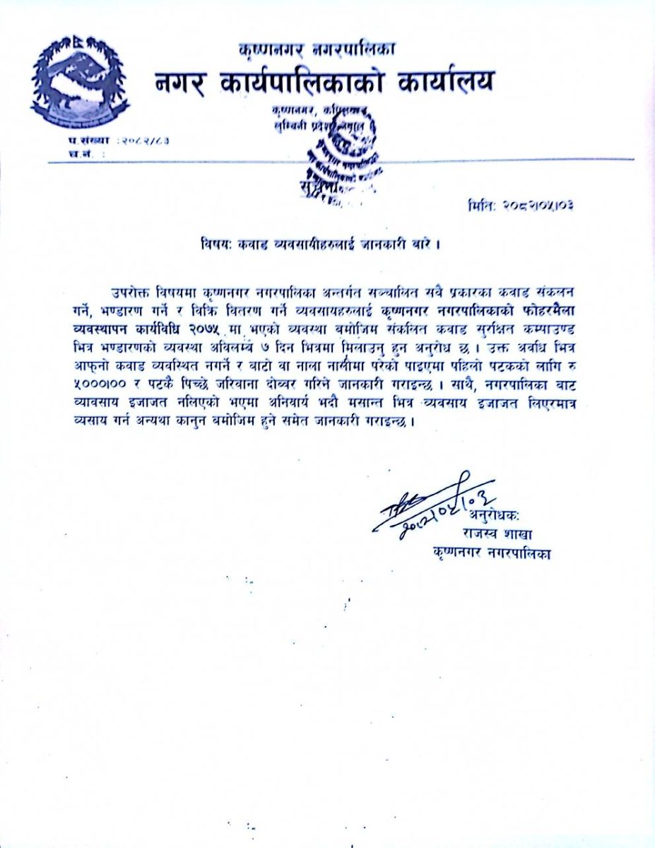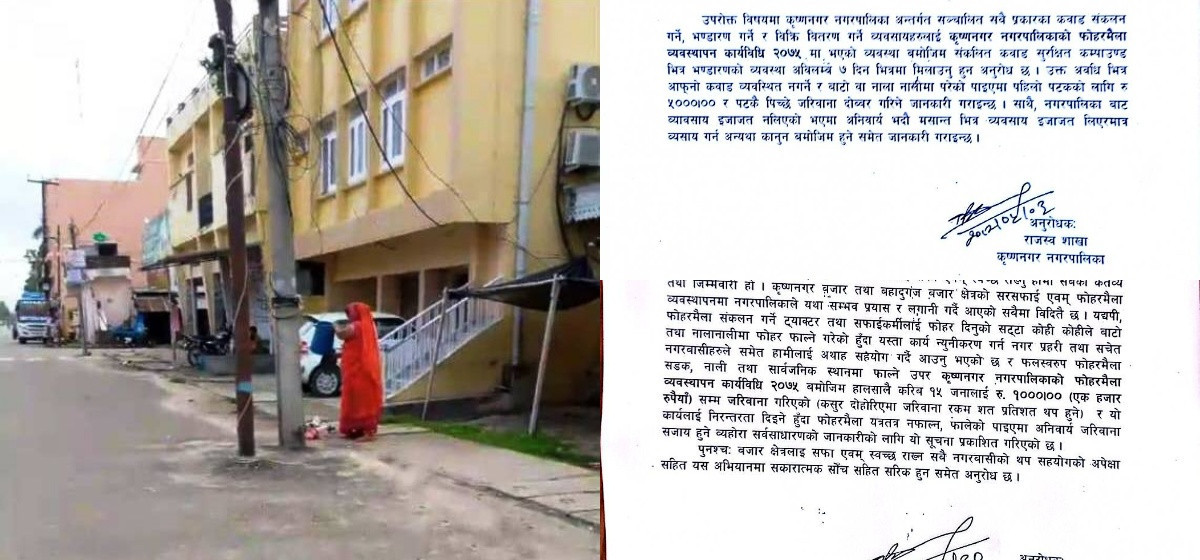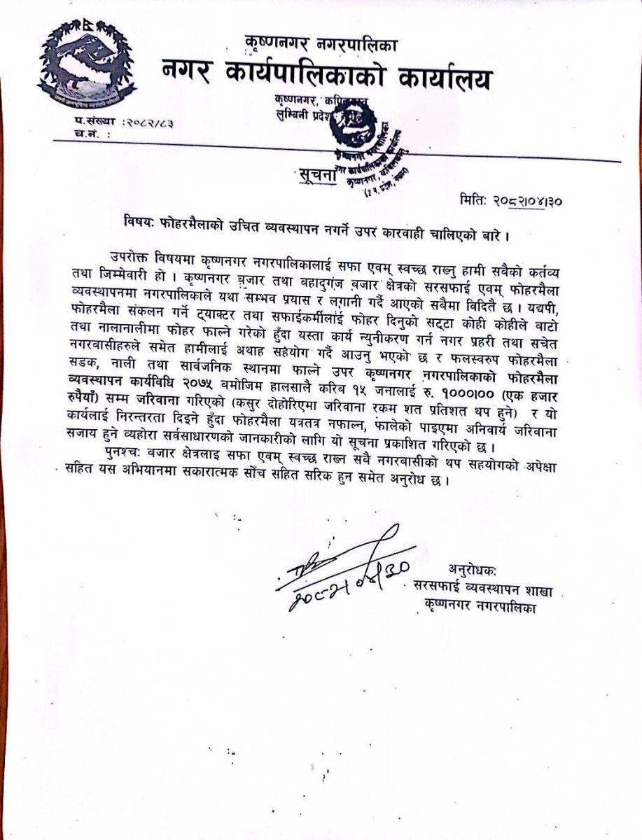 तर पहिलो पटकका लागि ५ सय देखि एक हजार जरिवाना तोकिएको छ। फेरि त्यस्तो गरेको पाइए जरिवाना दोब्बर असुल्ने गरी सूचना जारी गरिएको छ। नगरपालिकाले फोहर व्यवस्थापनमा कडाइ गरेपछि अहिले कृष्णनगर बजार सफा देखिएको व्यापारीहरू बताउँछन्। नगरपालिको यो अभियानमा सबैले साथ दिनुपर्ने उनीहरूको भनाइ छ। उता कवाड व्यवसायीलाई समेत आफ्नो मालसामान व्यवस्थित राख्न र फोहर नगर्न नगरपालिकाले सूचना निकालेको छ। कवाड व्यवसायीले सार्वजनिक स्थलमा फोहर गरेको पाइए ५ हजार जरिवाना तिराउने जनाइएको छ।