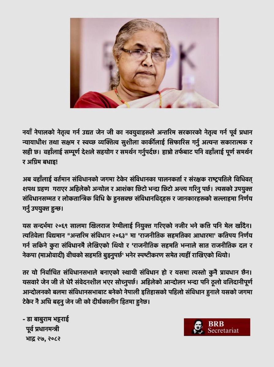 एक विज्ञप्ति जारी गर्दै डा भट्टराईले पूर्वन्यायाधीशको नेतृत्वमा बन्ने अन्तरिम सरकारलाई सम्पूर्णले साथ र सहयोग गर्नुपर्ने बताए । उनले लेखेका छन्, ‘नयाँ नेपालको नेतृत्व गर्न उद्यत जेन-जीका नवयुवाहरूले अन्तरिम सरकारको नेतृत्व गर्न पूर्वप्रधानन्यायाधीश तथा सक्षम र स्वच्छ व्यक्तित्व सुशीला कार्कीलाई सिफारिस गर्नु अत्यन्त सकारात्मक र सही छ। उहाँलाई सम्पूर्ण देशले सहयोग र समर्थन गर्नुपर्दछ । हाम्रो तर्फबाट पनि उहाँलाई पूर्ण समर्थन र अग्रिम बधाइ !’