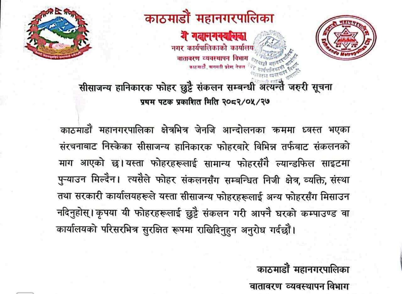 यसैबीच, महानगरपालिकाले सीसाजन्य तथा हानिकारक फोहरलाई व्यवस्थापन गर्न सम्बन्धित पक्षलाई अनुरोध गरेको छ ।