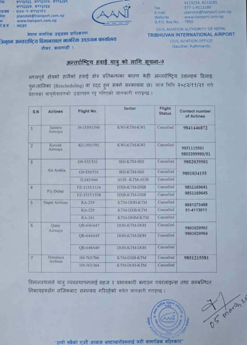 त्रिभुवन अन्तर्राष्ट्रिय विमानस्थल नागरिक उड्डयन कार्यालयले सूचना जारी गरेर आज (बिहीबार) मात्रै जजीरा एयरवेज, कुवेत एयरवेज, एयर अरेबिया, फ्लाइ दुबई, नेपाल एयरलाइन्स, कतार एयरवेज र हिमालय एयरलाइन्सका गरेर १५ अन्तर्राष्ट्रिय उडान रद्द गरेको जानकारी गराएको हो।