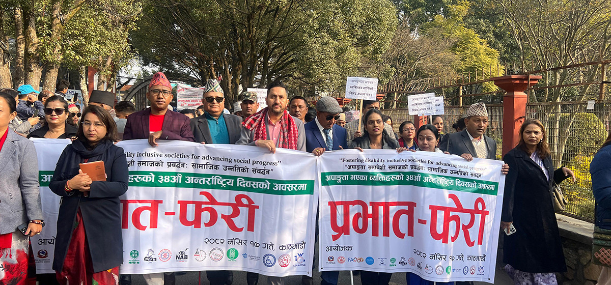 अपाङ्गता भएका व्यक्तिहरूको ३४औँ अन्तरराष्ट्रिय दिवसका अवसरमा सञ्चार तथा सूचना प्रविधिमन्त्री जगदीश खरेलको नेतृत्वमा आज यहाँ प्रभातफेरी आयोजना गरिएको छ।
