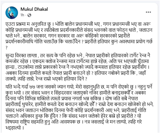 उनले लेखेका छन्, ‘एउटा प्रश्नमा म अनुत्तरित छु। भोलि बालेन प्रधानमन्त्री भए, गगन प्रधानमन्त्री भए वा अरू कोही प्रधानमन्त्री भए र त्यतिबेला प्रदर्शनकारीले संसद् भवनको पर्खाल फोड्न थाले, जलाउन थाले भने बालेन सरकार, गगन सरकार वा अरू कोहीको सरकारको प्रहरीले प्रदर्शनकारीमाथि गोली चलाउँछ कि चलाउँदैन? प्रहरीले हतियार कुन अवस्थामा प्रयोग गर्छ?’