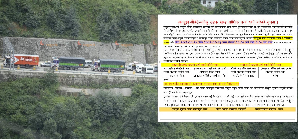 सूचना अनुसार नागढुंगा देखि पिप्लामोडसम्म र पोखरेभिर क्षेत्रमा यही मंसिर २४ गतेदेखि आगामी पुस १ गतेसम्म बिहान १०:३० बजेदेखि अपराह्न ३:३० बजेसम्म सडक आवागमन बन्द हुनेछ। सो समयमा वैकल्पिक सडक प्रयोग गरिदिन तथा आफ्नो यात्रा समयलाई सो समयभन्दा अगाडि वा पछाडि व्यवस्थापन गर्न सूचनामा आग्रह गरिएको छ।