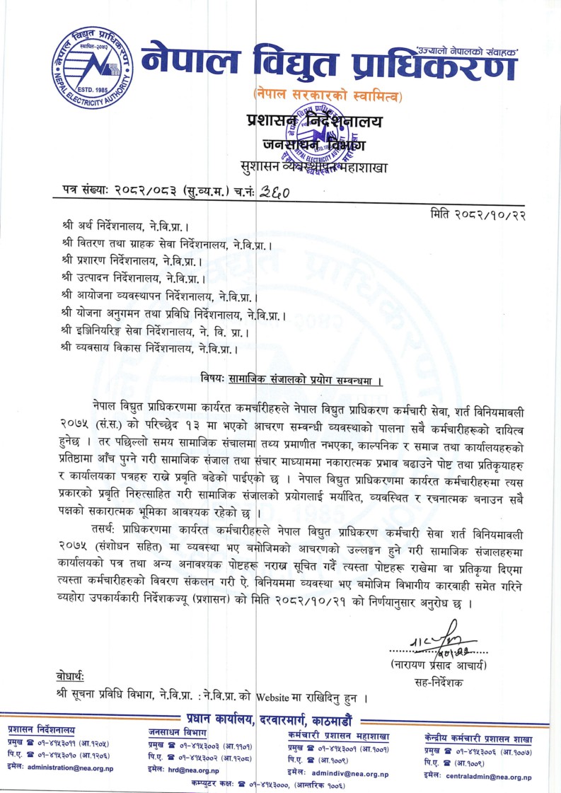 नेपाल विद्युत् प्राधिकरणले आफ्ना कर्मचारीलाई सामाजिक सञ्जाल प्रयोग गर्दा संस्थाको मर्यादा र गरिमाको ख्याल गर्न सचेत गराएको छ।
