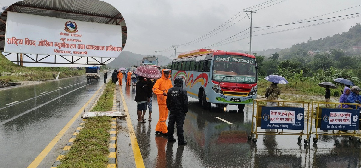राष्ट्रिय विपद् जोखिम न्यूनीकरण तथा व्यवस्थापन प्राधिकरणले देशभर भारीदेखि अति भारी वर्षाका कारण राजमार्गमा रोकिएका यात्रुलाई सुरक्षित स्थानमा राखेर खानपान, स्वास्थ्योपचार र अन्य आवश्यक सुविधा उपलब्ध गराउन आग्रह गरेको छ।