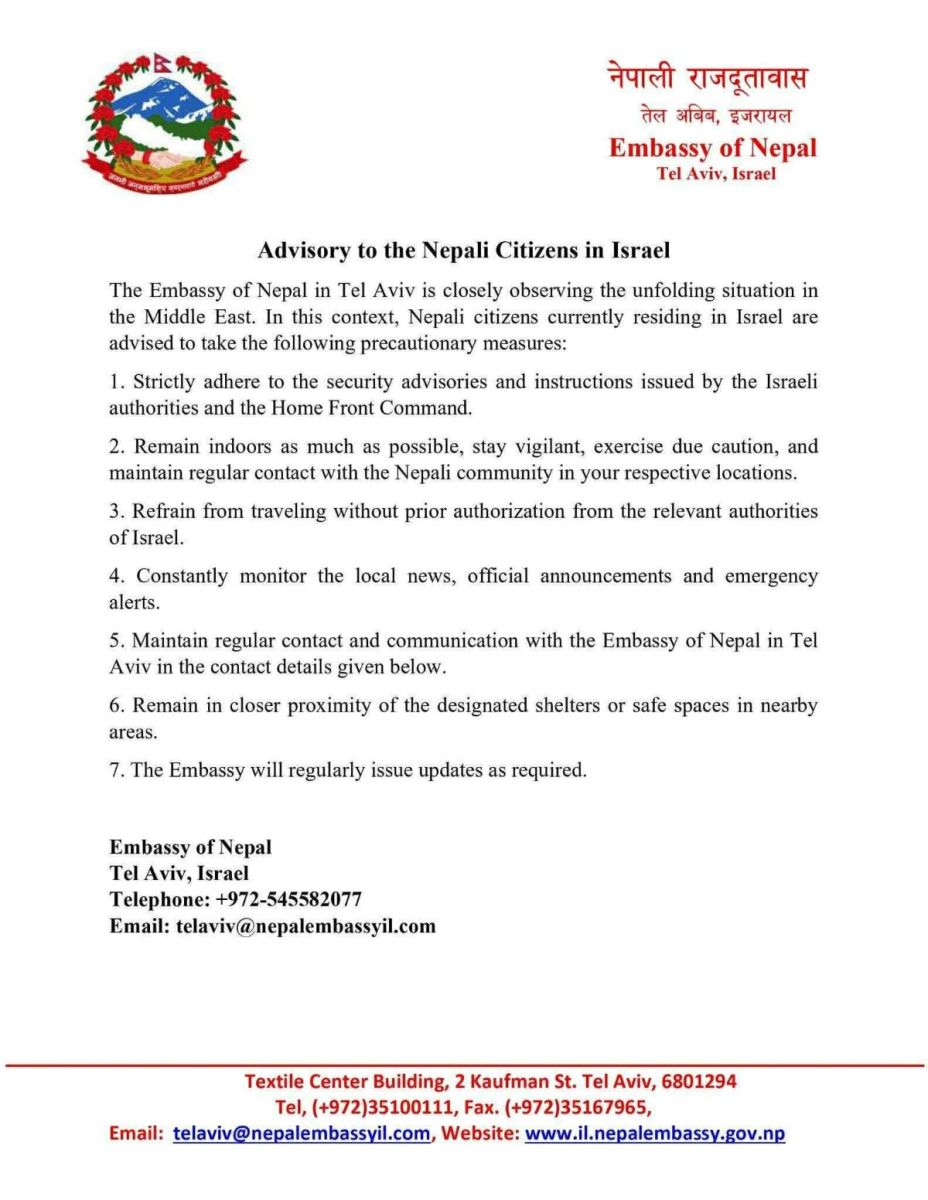 मध्यपूर्वमा विकसित पछिल्लो घटनाक्रम र सुरक्षा परिस्थितिलाई मध्यनजर गर्दै इजरायलको तेल अबिबस्थित नेपाली राजदूतावासले त्यहाँ रहेका नेपाली नागरिकहरूका लागि विशेष सुरक्षा एड्भाइजरी जारी गरेको छ।