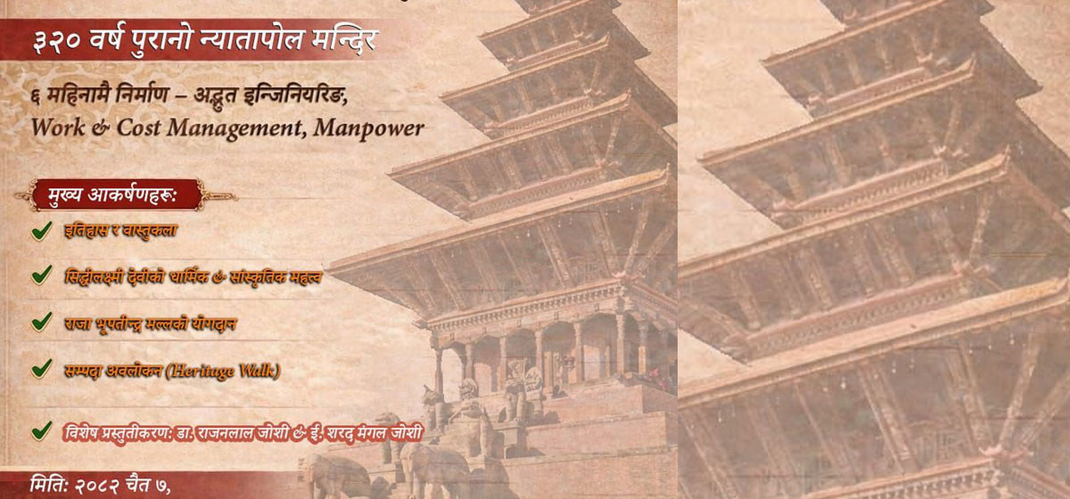 जोशी समाज येँ पुचको आयोजनामा न्यातपोल सम्पदा यात्रा हुने भएको छ । भक्तपुरको विश्वप्रसिद्ध पाँचतल्ले मन्दिर (न्यातापोल) मन्दिरको विशेषतालाई संसारसमक्ष झल्काउने उद्देश्यका साथ चैत ७ गते शनिबार यात्रा हुन लागेको आयोजकले जनाएको छ ।