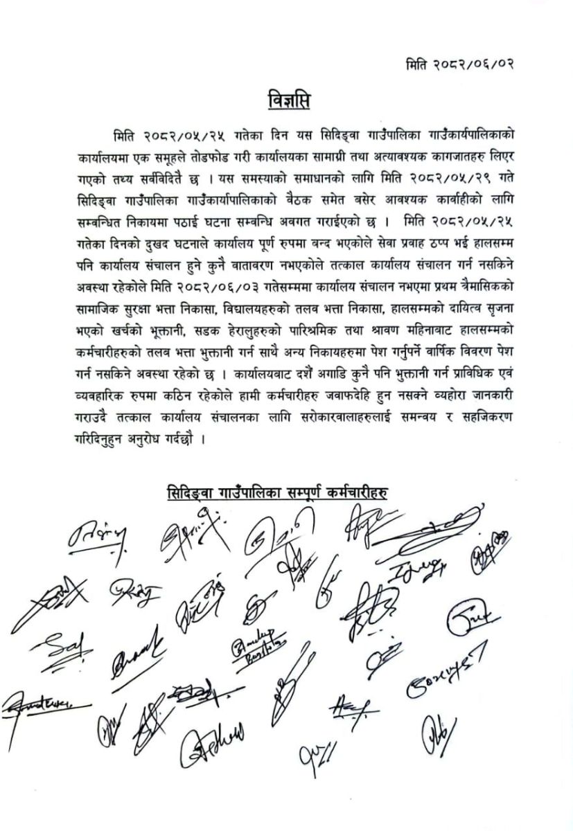 उनीहरूले अहिलेसम्म ठप्प रहेको कार्यालय सञ्चालनको वातावरण बनाउन सहजीकरण र समन्वय गरिदिन सरोकारवालालाई आग्रह गरेका छन्। गत भदौ २५ गते एक समूहले गाउँ कार्यपालिकाको कार्यालयमा तोडफोड गरी सामग्री र आवश्यक कागजात लिएर गएको दिनबाट कार्यालयको कामकाज ठप्प भएको कर्मचारीले सामूहिक हस्ताक्षर गरी जारी गरेको विज्ञप्तिमा उल्लेख छ।