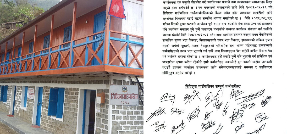 एक समूहले कार्यालय तोडफोड र आवश्यक कागजात लिएर गएको भन्दै ताप्लेजुङको सिदिङ्वा गाउँपालिकाका कर्मचारीले दशैंअघि कुनै पनि भुक्तानी गर्न नसक्ने घोषणा गरेका छन्।