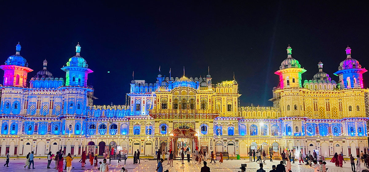 धनकी देवी लक्ष्मीको पूजा आराधना गरिने तिहारको तेस्रो दिन सोमबार साँझ जनकपुरधामस्थित प्रसिद्ध जानकी मन्दिर दीप र बत्तीले झकिझकाउ भएको छ।