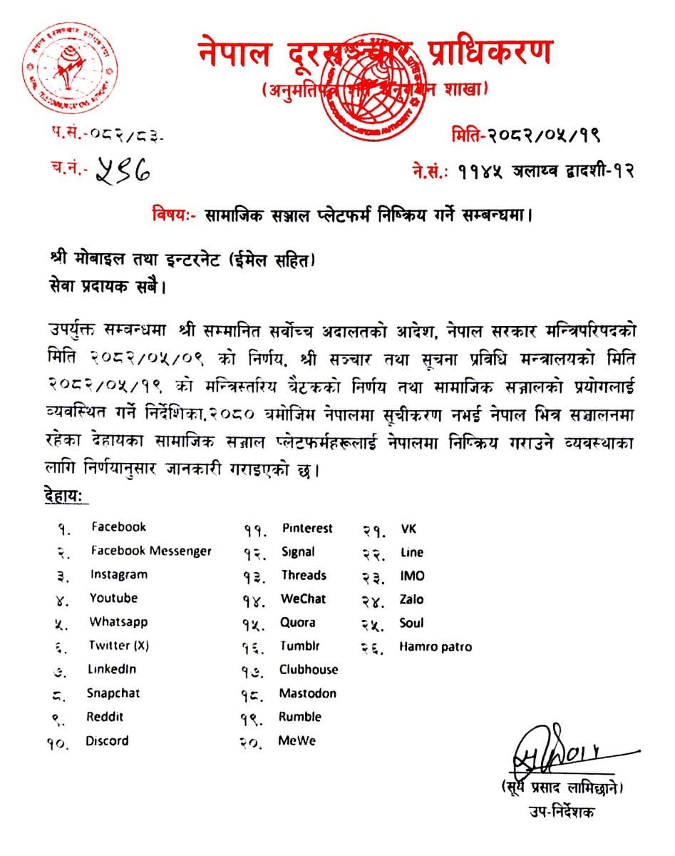 नेपालमा दर्ता नभएको भन्दै सरकारले फेसबुक, युट्युब, एक्स (पहिलेको ट्वीटर) लगायतका २६ वटा प्रमुख सामाजिक सञ्जालमाथि प्रतिबन्ध लगाउने निर्णय गरेको छ।