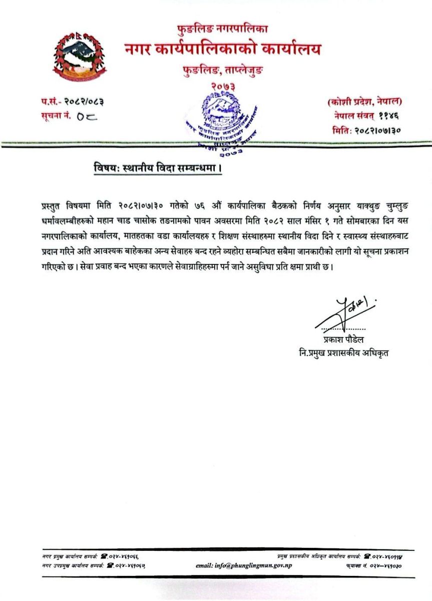 चासोक तङ्नाम(न्वागी खाने पर्व)को अवसरमा ताप्लेजुङको फुङलिङ नगरपालिकाले भोलि सार्वजनिक बिदा दिएको छ । नगरपालिकाको तर्फबाट निमित्त प्रमुख प्रशासकीय अधिकृत प्रकाश पौडेलले सार्वजनिक सूचनामार्फत याक्थुङ चुम्लुङ धर्मावलम्बीको चाड चासोक तङ्नामको अवसरमा एकदिन स्थानीय बिदा दिने निर्णय भएको बताएका छन् ।