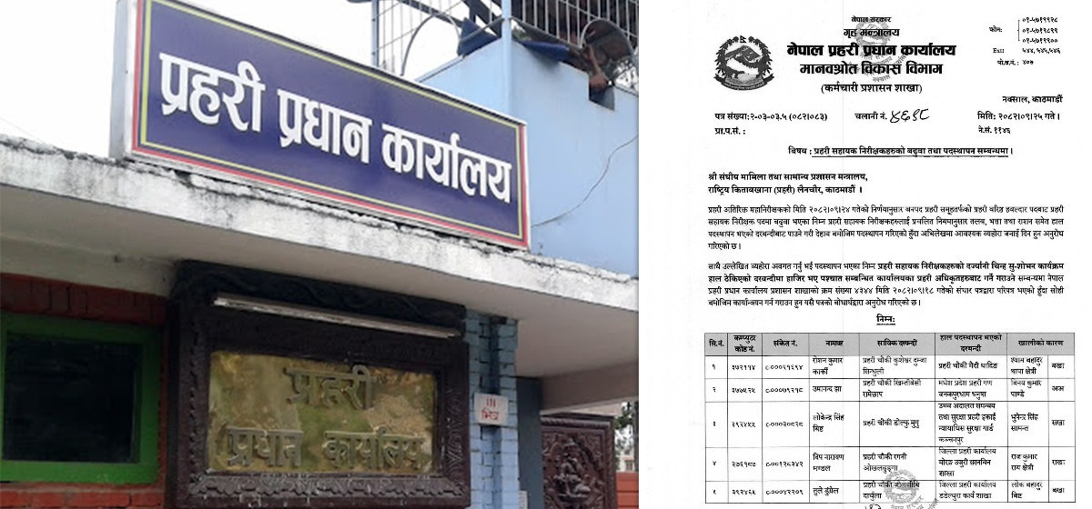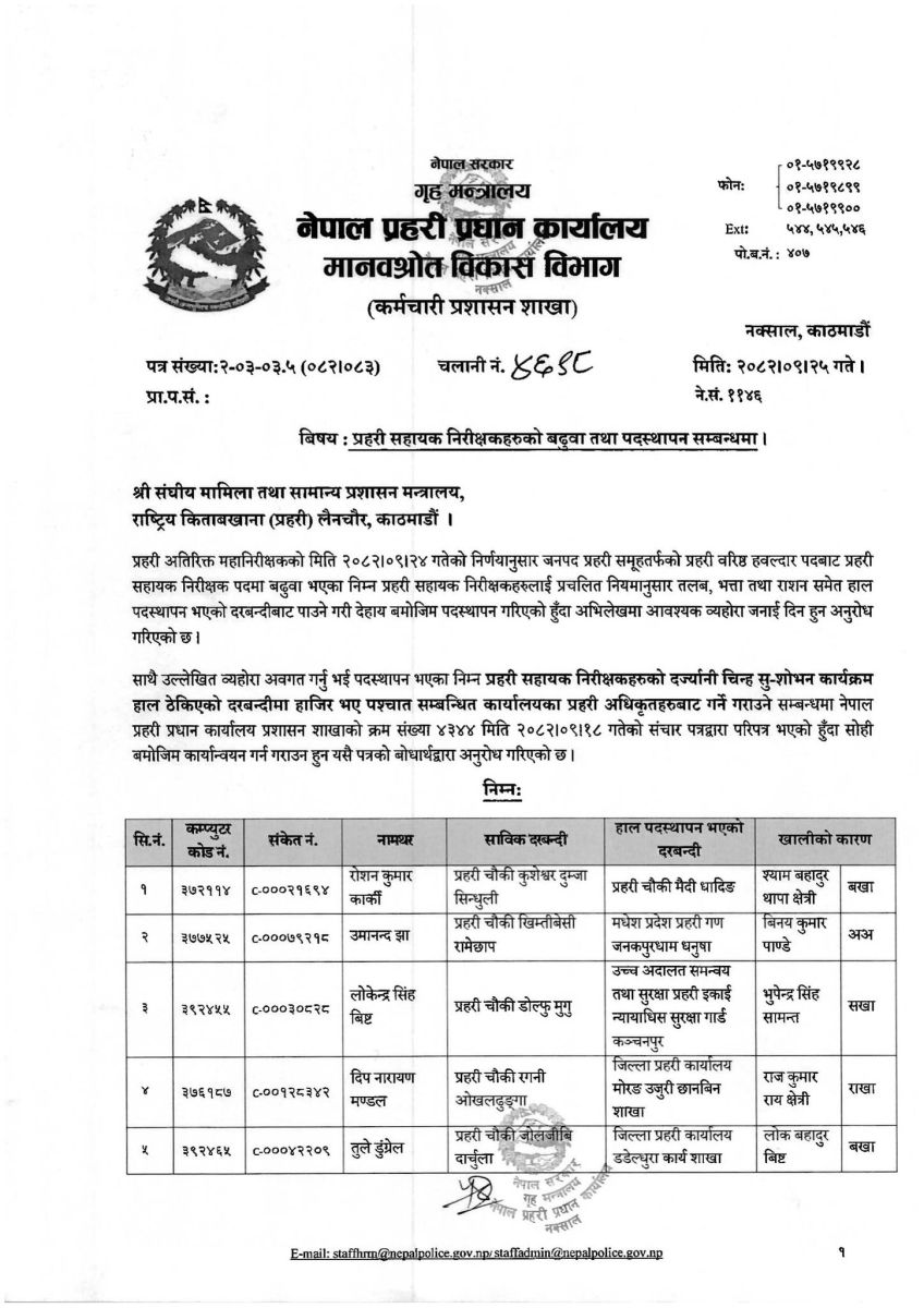 प्रहरी अतिरिक्त महानिरीक्षकको बिहीबारको निर्णयअनुसार प्रहरी वरिष्ठ हवल्दार पदबाट प्रहरी सहायक निरीक्षक पदमा बढुवा भएका ४२४ जना प्रहरी सहायक निरीक्षकहरूलाई हालको दरबन्दीबाट तलब, भत्ता तथा राशनसहित पदस्थापन गरिएको हो।