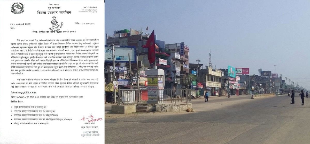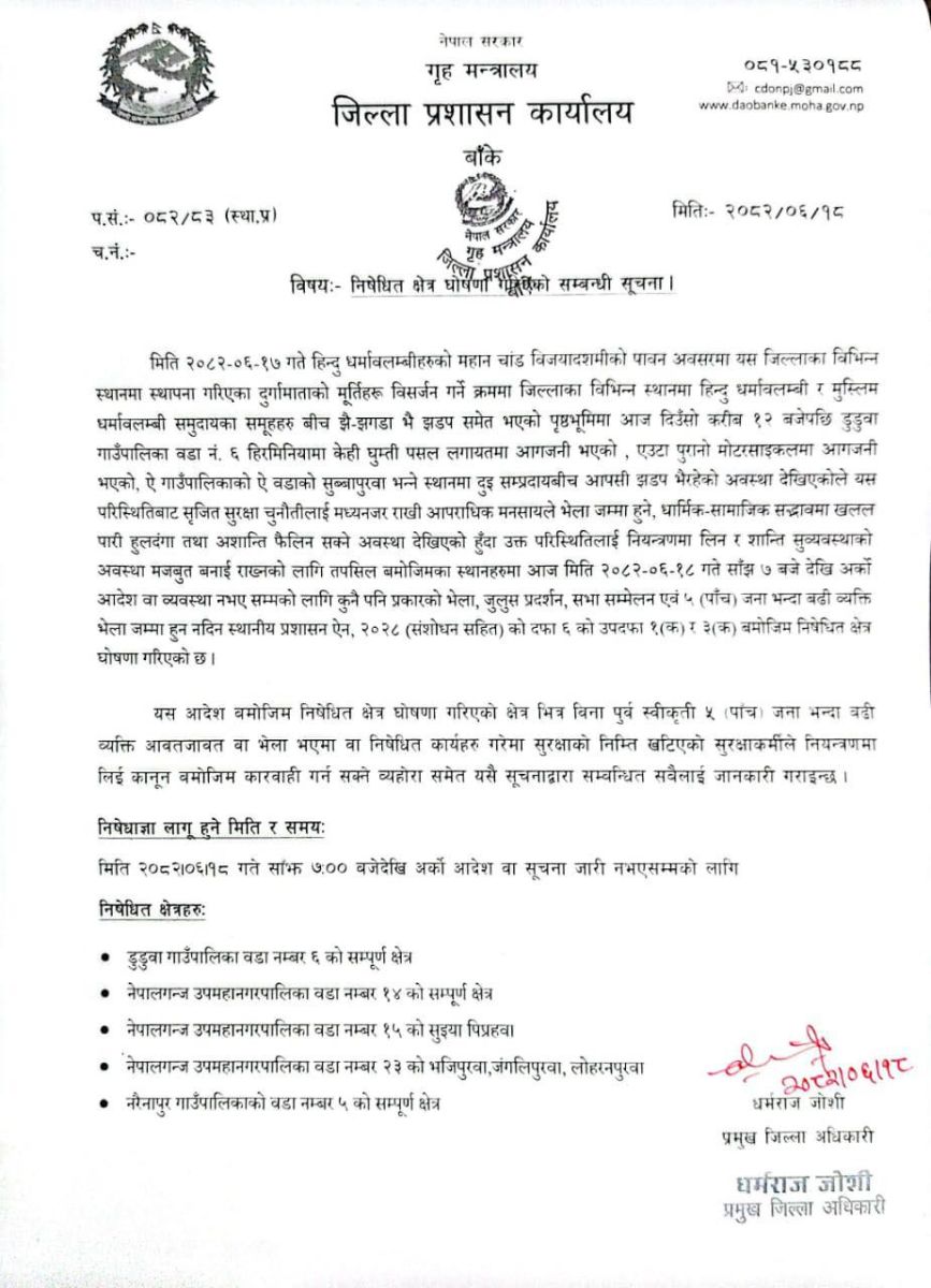 जिल्ला प्रशासन कार्यालय बाँकेले नेपालगन्ज उपमहानगरपालिका, डुडुवा गाउँपालिका र नरैनापुर गाउँपालिकाका केही क्षेत्रमा निषेधाज्ञा जारी गरेको छ। दुर्गा मूर्ति विसर्जनका क्रममा शुक्रबार दिउँसो दुई समुदायबिच झडप भएपछि शनिबार निषेधाज्ञा जारी गरिएको हो। प्रमुख जिल्ला अधिकारी धर्मराज जोशीले शनिबार साँझ ७ बजेदेखि अर्को सूचना नआउन्जेल निषेधाज्ञा जारी गरिएको जानकारी दिए।