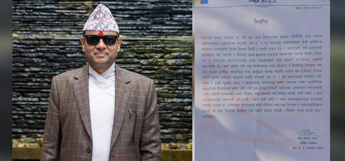 राप्रपा रुपन्देही २ का क्षेत्रीय अध्यक्ष रामबहादुर थापाले विज्ञप्ति जारी गर्दै राप्रपाकोे सिद्धान्त र वैचारिक भिन्नता भएपनि वर्तमान राजनीतिक परिस्थितिमा आर्थिक, सामाजिक तथा समृद्धिको एजेन्डामा नेपाली कांग्रेससँग नजिक रहेकाले रुपन्देहीको क्षेत्र नं. २ मा कांग्रेस उम्मेदवारलाई चुन्नप्रसाद शर्मा पौडेललाई समर्थन गर्ने निर्णय गरेका हुन्।