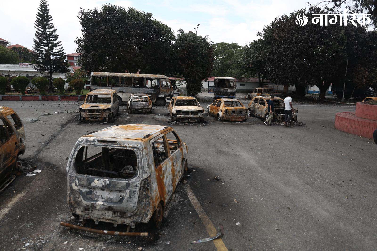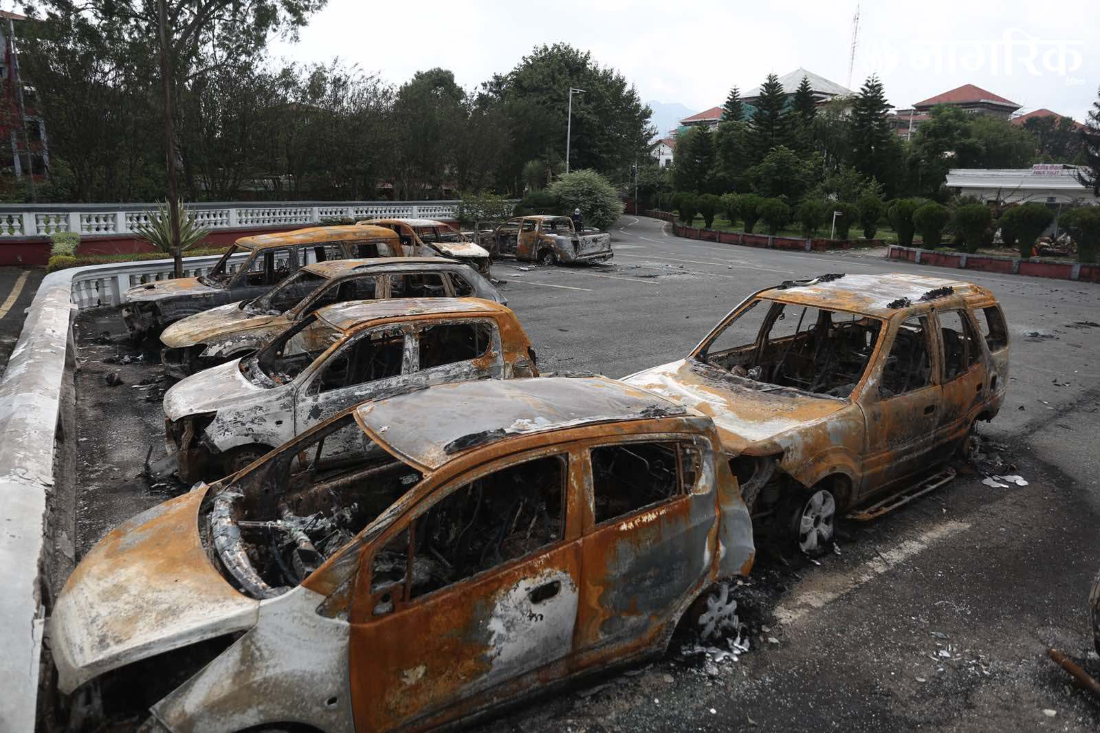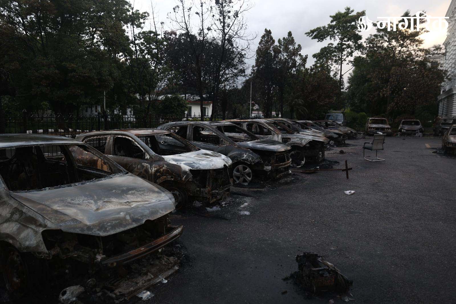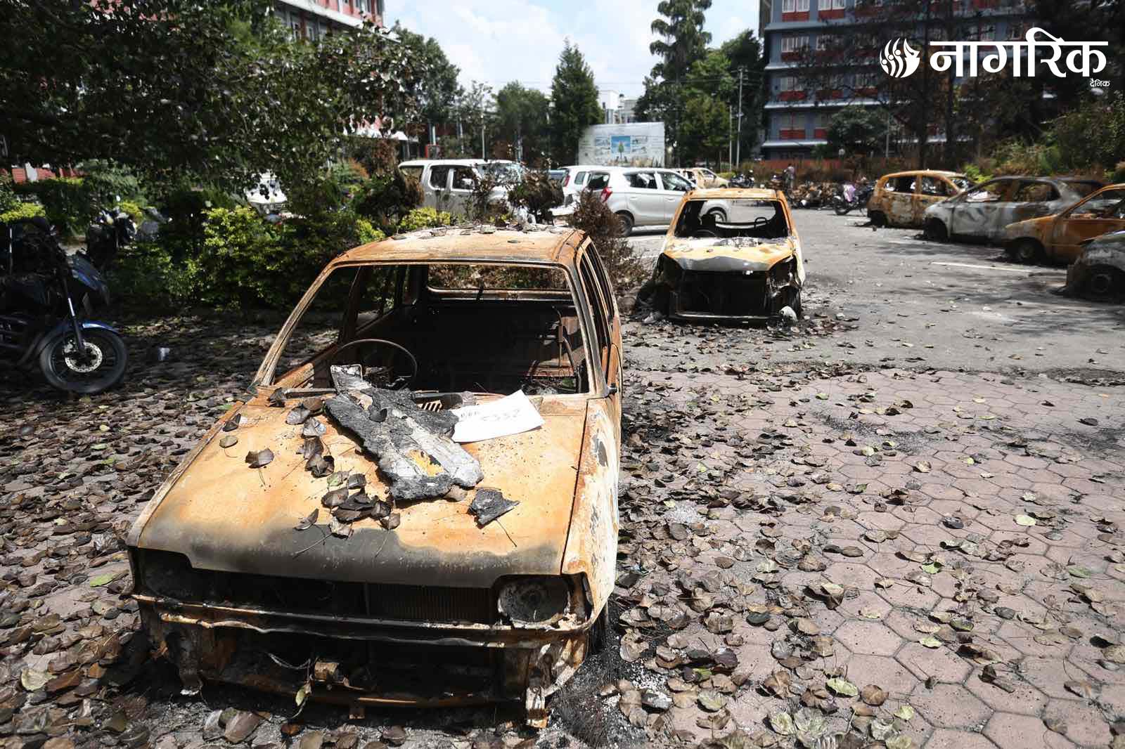 मन्त्रालय परिसरमा रहेका दर्जनौं सवारीसाधनहरू जलेर ध्वस्त भएका छन्।