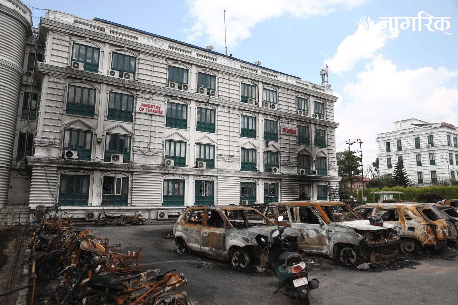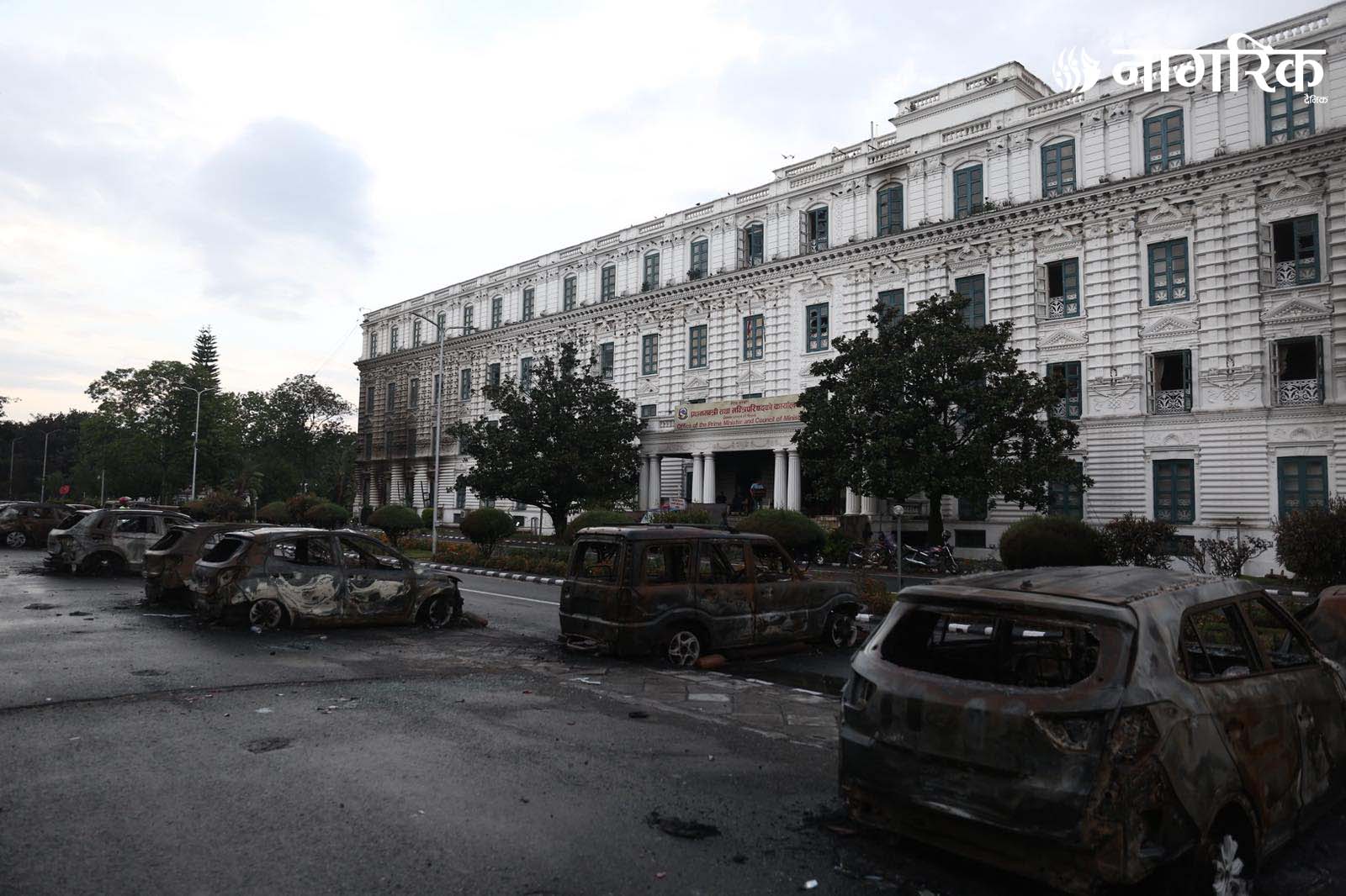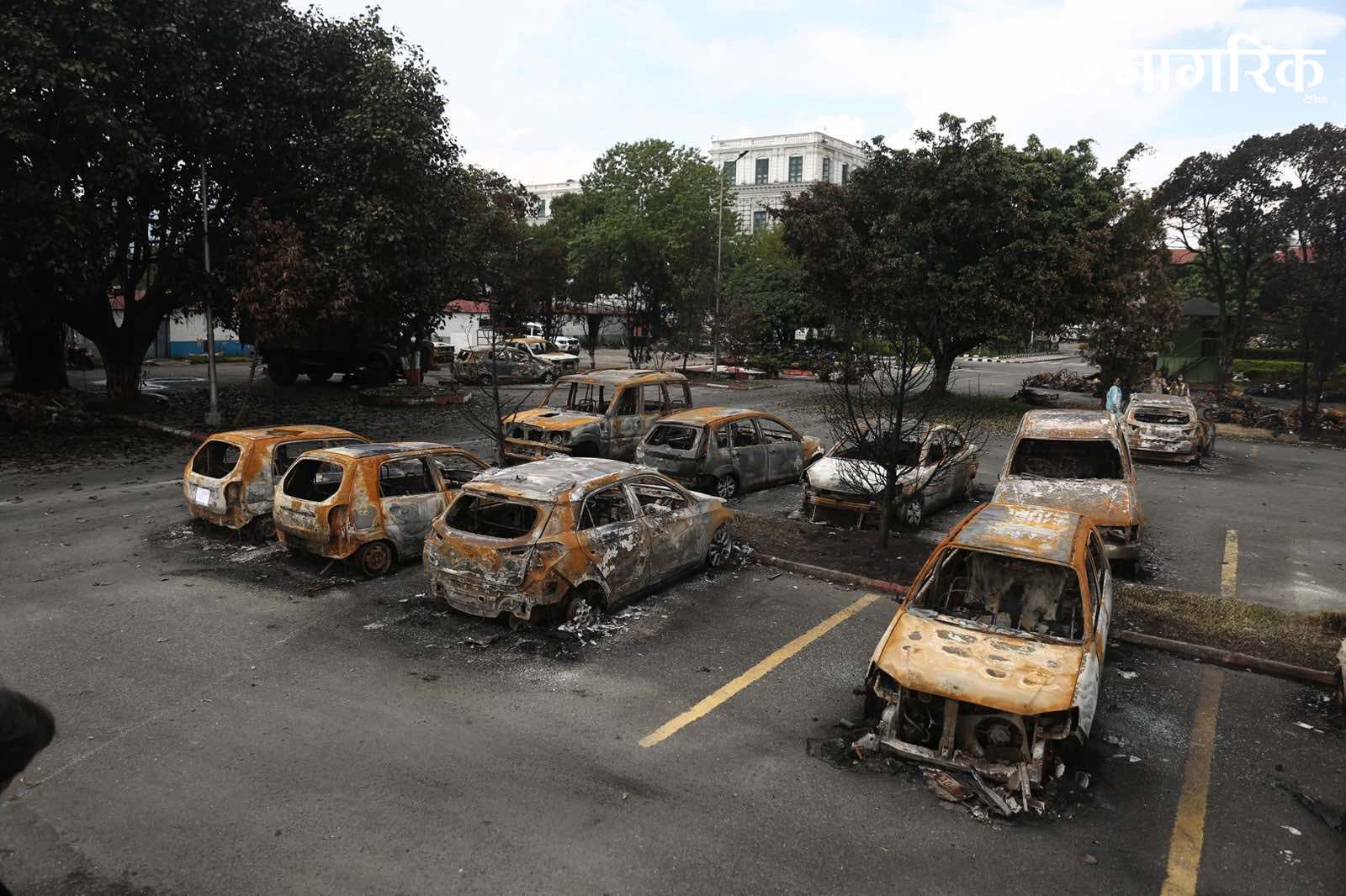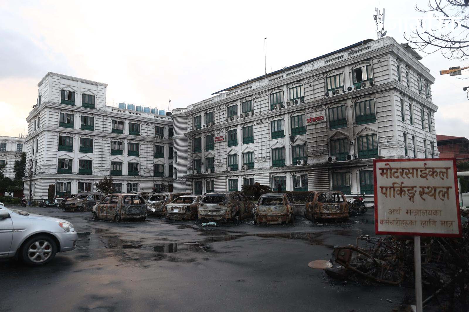 मन्त्रालय परिसरमा रहेका दर्जनौं सवारीसाधनहरू जलेर ध्वस्त भएका छन्।
