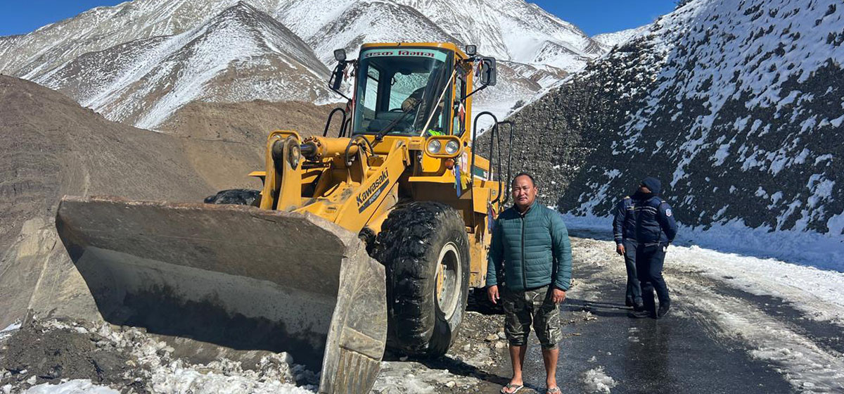 वारागुङ मुक्तिक्षेत्र-४ का वडाध्यक्ष कर्माघ्याचो गुरुङको उपस्थितिमा अवरुद्ध कागबेनी–मुक्तिनाथ सडकको हिउँ सफा गर्ने काम सुरु गरिएको छ।