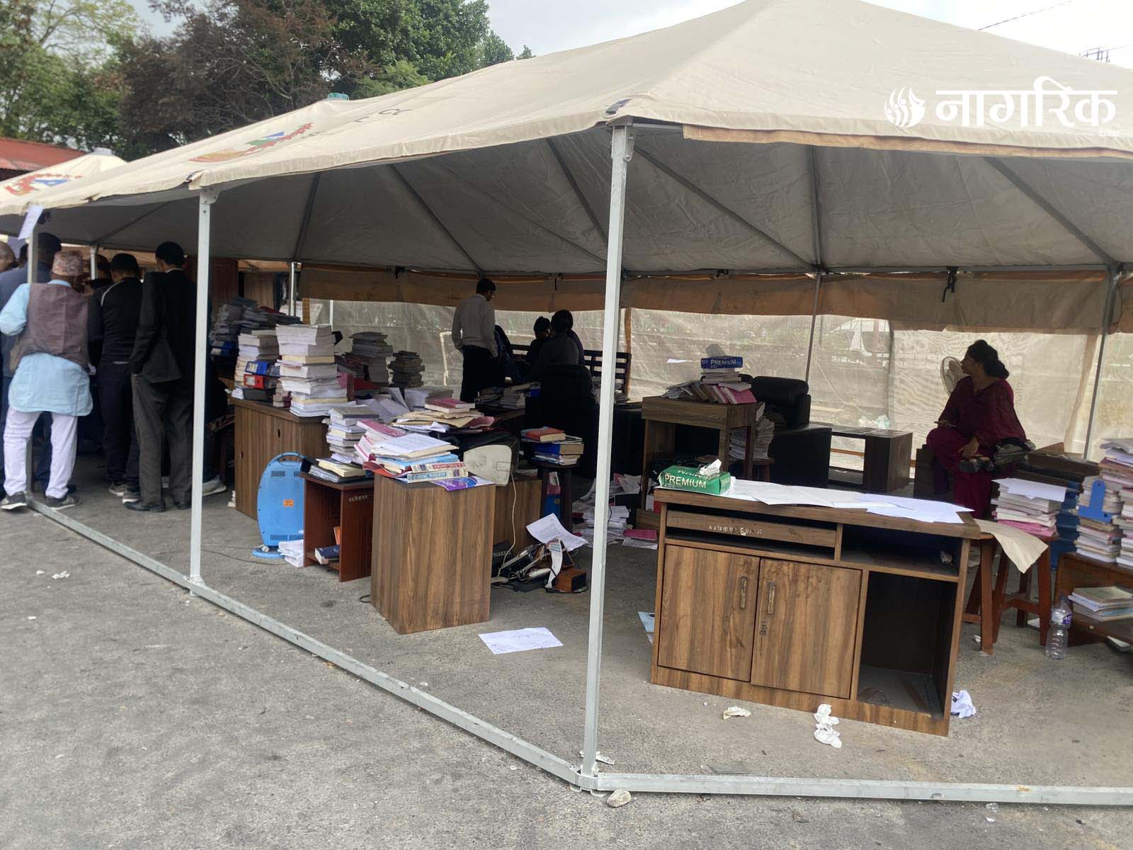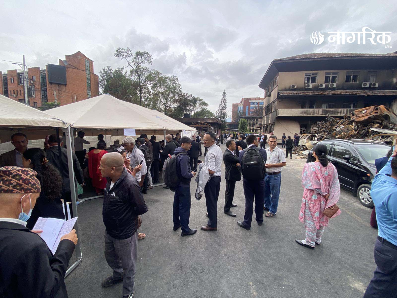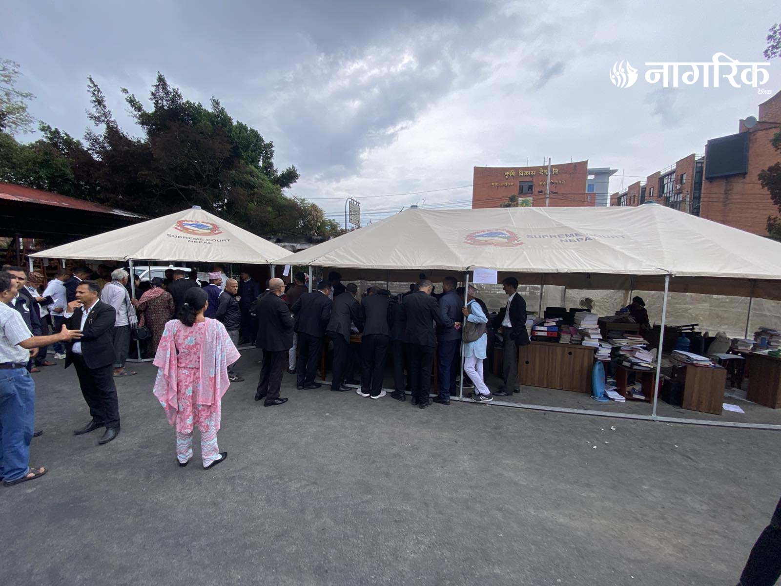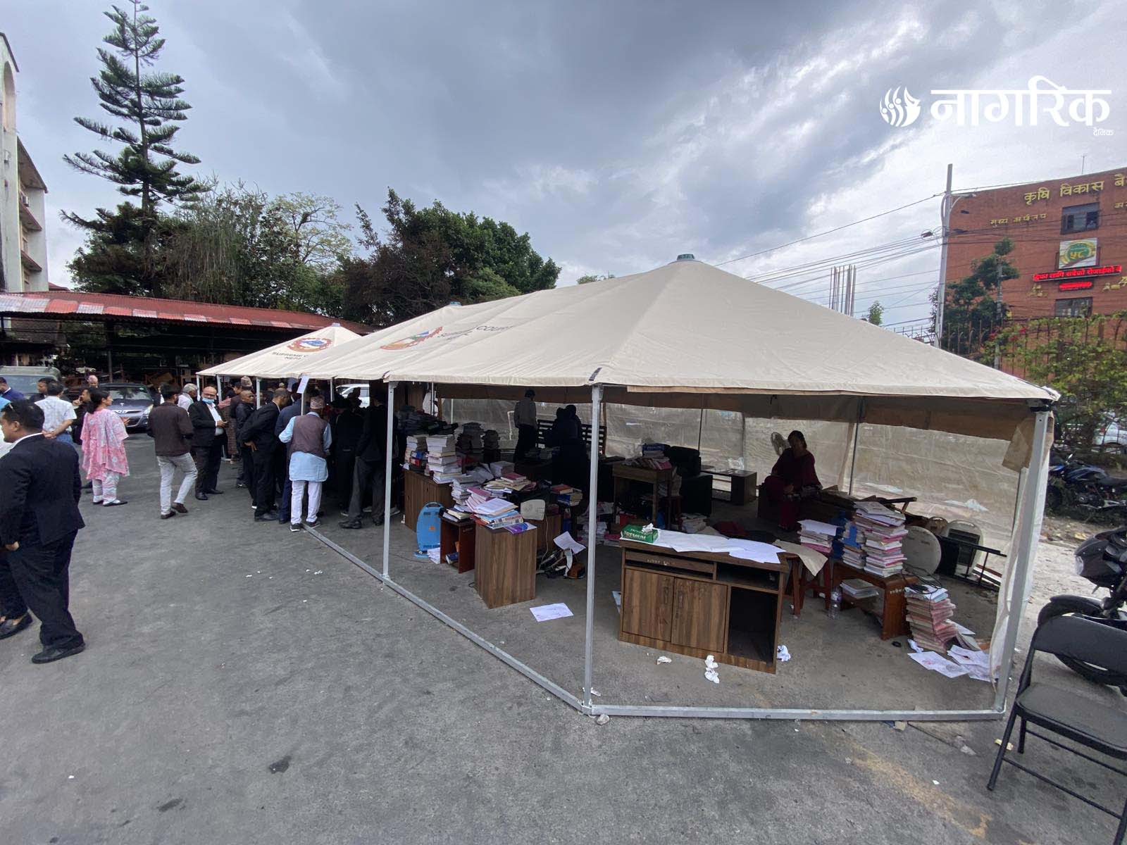 न्यायको मन्दिर भग्नावशेषमा परिणत भएपछि आइतबारदेखि कर्मचारीहरूले परिसरमा टेन्ट टाँगेर तारिख दिने र रिट दर्ता गर्ने काम थालेका छन्।