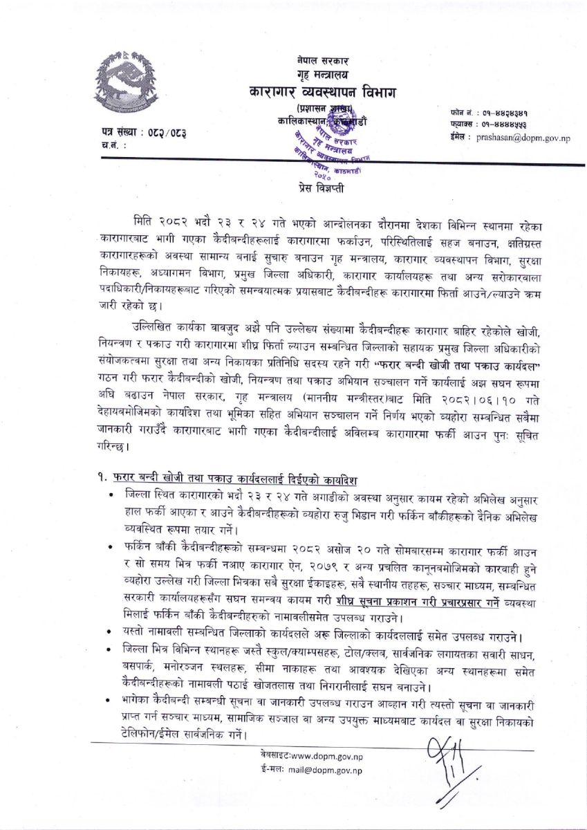 यस्तो छ कारागार विभागको प्रेस विज्ञप्ति