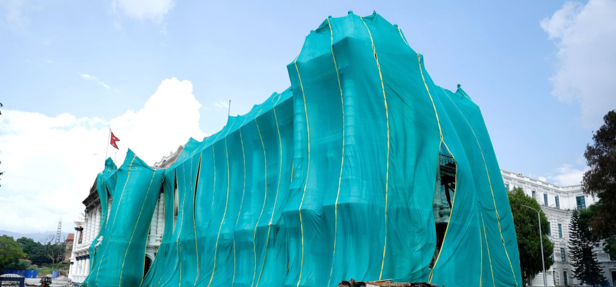 तस्बिरमा हेर्नुहोस् त्रिपालले छोपिएको सिंहदबार