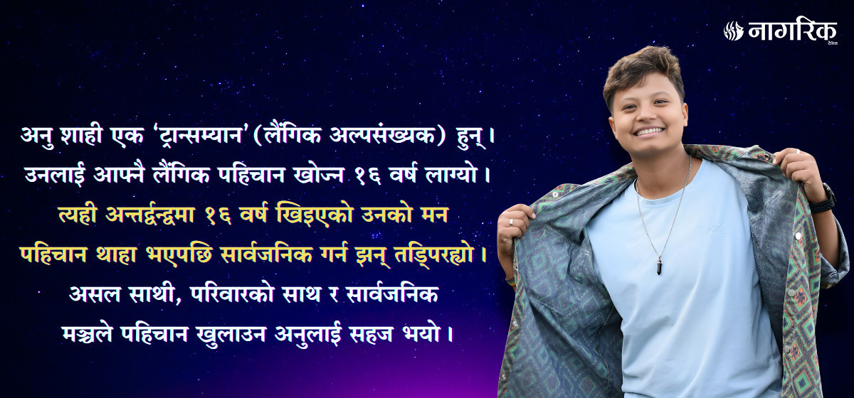 यद्यपि अनुले आफ्नो परिवारमा भने त्यो कुरा भन्न सकेका थिएनन् । एक दिन अकस्मात् उनकी दिदीले सोधिन–अनु तँ एलजिबिटिक्यू प्लस समुदायकी हो नि? अनुलाई हलुको महसुस भयो । ‘मैले सहजै भने–हो दिदी,’ उनले भने। अनुले दिदीसँग भनेको सुनाए, ‘म तपाईंको बहिनी भएर जन्मे पनि म छोरा हुँ जस्तो लाग्छ।’