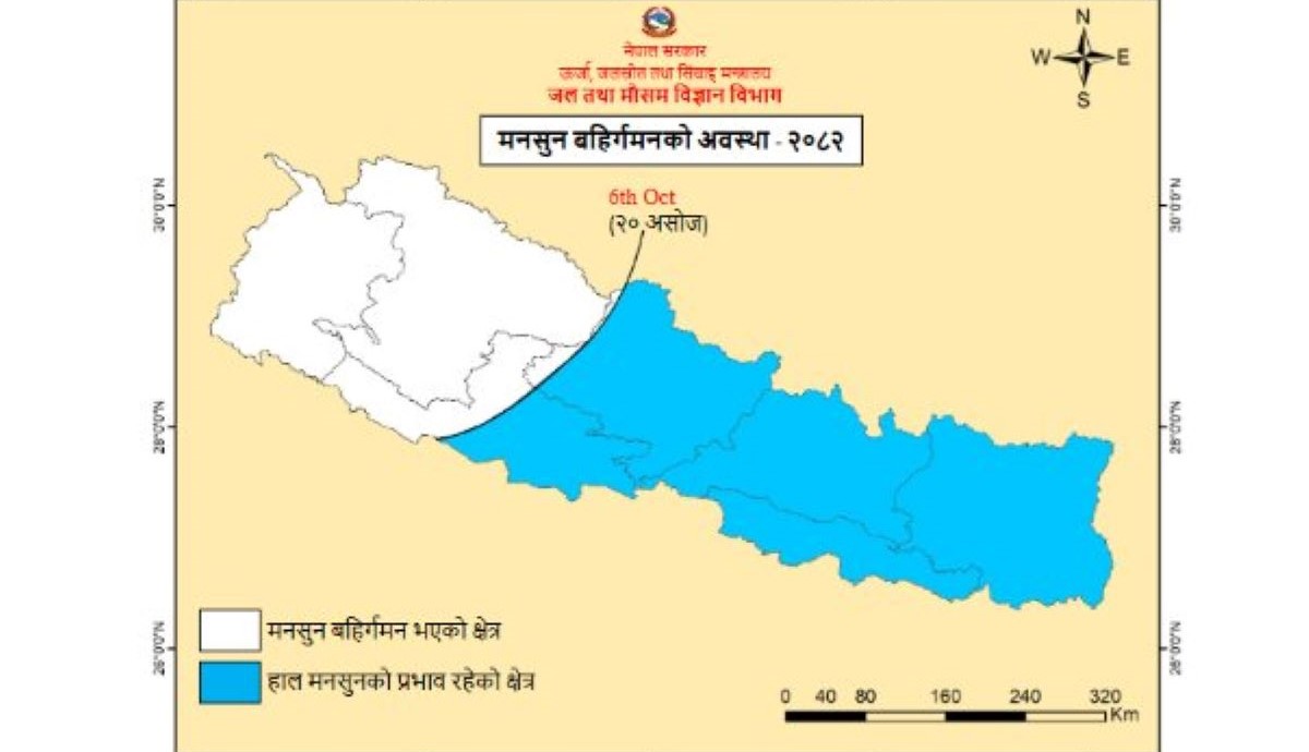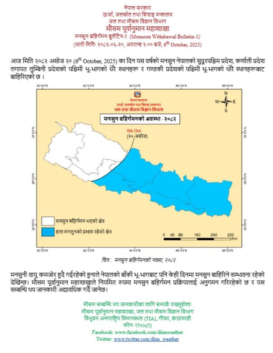 नेपालको पश्चिमी क्षेत्रबाट मनसुन बाहिरिन सुरु भएको छ। जल तथा मौसम विज्ञान विभाग, मौसम पूर्वानुमान महाशाखाले सोमबार एक विशेष बुलेटिन जारी गर्दै पश्चिमी क्षेत्रका धेरै स्थानबाट मनसुन बाहिरिएको जनाएको हो। सुदूरपश्चिम प्रदेश, कर्णाली प्रदेशसहित लुम्बिनी प्रदेश र गण्डकी प्रदेशको पश्चिमी भेगका थोरै स्थानबाट मनसुन बाहिरिएको बुलेटिनमा उल्लेख छ।