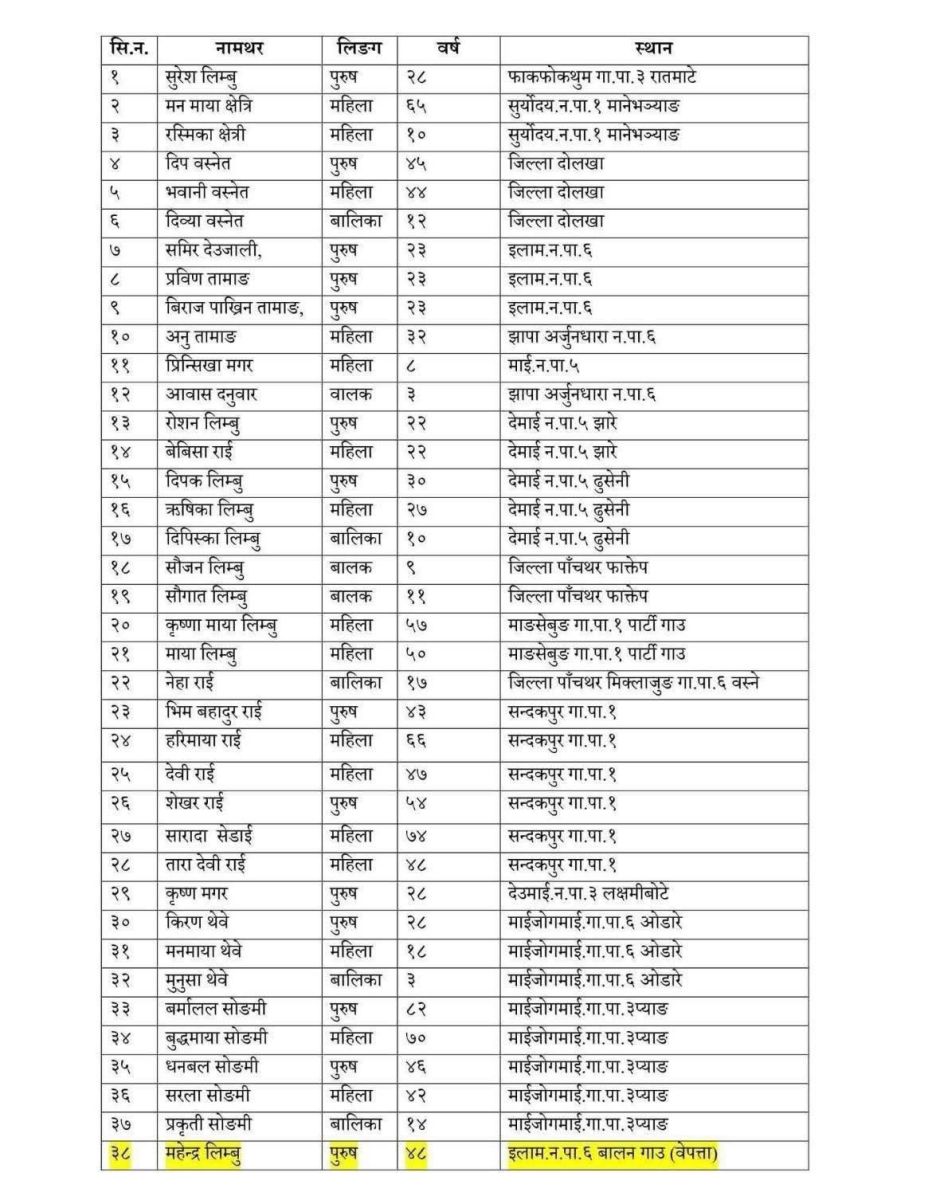 इलामको बाढी पहिरोमा ज्यान गुमाउने ३५ जनाकै सनाखत भएको छ । जिल्ला प्रहरी कार्यालय इलामले मृतकको नाम सार्वजनिक गर्दै घटनास्थलबाट उद्धारको काम जारी राखेको जनाएको छ ।