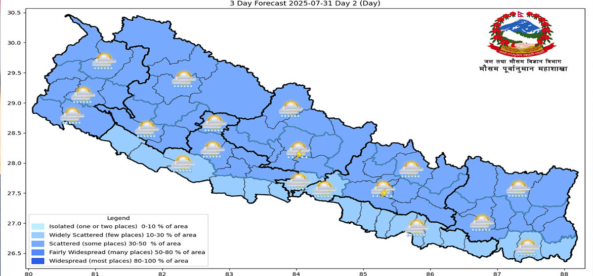 महाशाखाका अनुसार आज दिउँसो लुम्बिनी र सुदूरपश्चिम प्रदेशका पहाडी र तराई भेगमा साधारणतया आंशिक बदली हुने छ भने सुदूरपश्चिमलगायत पहाडी भागका केही स्थानमा र लुम्बिनी प्रदेशका तराईका एकदुई स्थानमा मेघगर्जन र चट्याङसहित मध्यम वर्षाको सम्भावना छ।