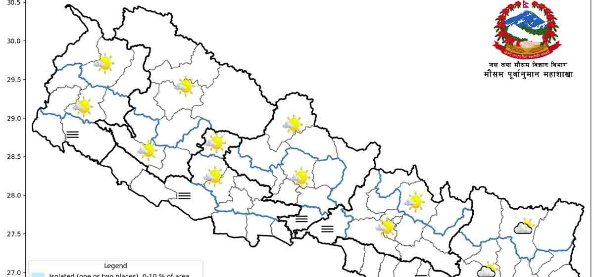 आज दिउँसो तराई भू–भागका केही स्थानमा मध्याह्नसम्म हुस्सु रहनेछ। लुम्बिनी, कर्णाली र सुदूरपश्चिम प्रदेशमा बादल र बाँकी भागमा आंशिक बादल लाग्नेछ। त्यसैगरी, आज राति तराईका केही स्थानमा तुँवालो रहनेछ। कोशी र गण्डकी प्रदेशका उच्च पहाडी र हिमाली भागमा बादल लाग्नेछ र बाँकी भू–भागमा आंशिक बादल लाग्नेछ। कोशी र गण्डकी प्रदेशका उच्च पहाडी र हिमाली भागका एकदुई स्थानमा हल्का वर्षा र हिमपातको सम्भावना छ।