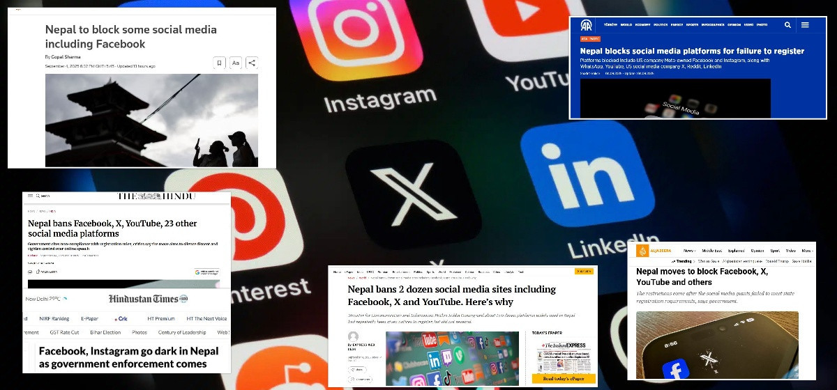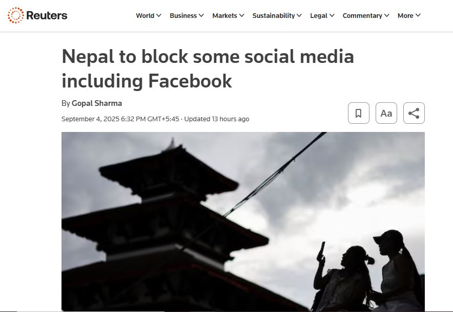 बेलायती समाचार एजेन्सी रोयटर्स र सिंगापुरको द स्ट्रेट्स टाइम्सले समान कोणबाट यो समाचार प्रस्तुत गरेका छन्। रोयटर्सका अनुसार नेपाल सरकारले नक्कली आइडी प्रयोग गरी घृणा, अफवाह र साइबर अपराध फैलाउने गतिविधिलाई नियन्त्रण गर्न सामाजिक सञ्जालमाथि प्रतिबन्ध लगाएको हो। स्ट्रेट्स टाइम्सले पनि यही कारण उल्लेख गर्दै कम्पनीहरूलाई सञ्चार तथा सूचना प्रविधि मन्त्रालयमा दर्ता गर्न र स्थानीय सम्पर्क, गुनासो सम्हाल्ने व्यक्ति र स्व-नियमनको जिम्मेवार व्यक्ति तोक्न सेप्टेम्बर ३ सम्मको समयसीमा दिइएको उल्लेख गरेको छ।