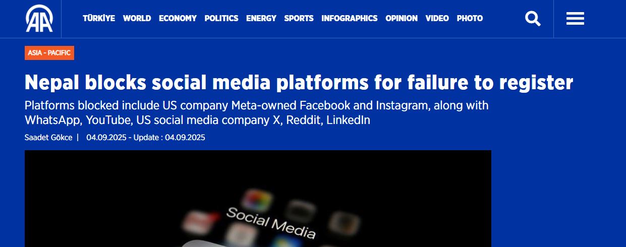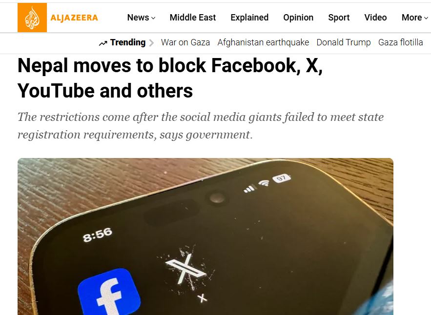 यस्तै, अल जजीराले पनि यो कदमलाई घृणा र साइबर अपराध नियन्त्रणको सरकारी प्रयासको हिस्सा मानेको छ, तर मन्त्रालयका प्रवक्ता गजेन्द्र कुमार ठाकुरलाई उद्धृत गर्दै कम्पनीहरूलाई दर्ता गर्न बारम्बार आग्रह गरिए पनि बेवास्ता गरिएकोले प्रतिबन्ध लगाइएको उल्लेख गरेको छ। मेटा, अल्फाबेट, एक्स, रेडिट र लिंक्डइनले समयसीमा भित्र दर्ता नगरेको अल जजीराले जनाएको छ।
