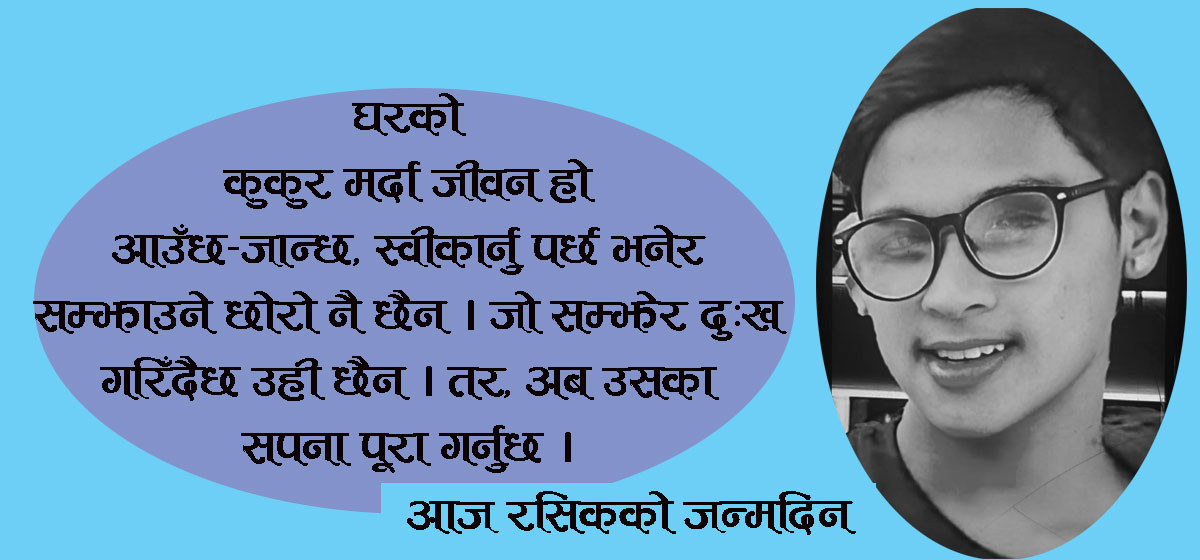 सडकमा रहेका असहायहरुको खोजी गर्दै चिया खुवाउँदै थिए । जेनजी आन्दोलनमा शहीद भएका रसिक खतिवडा खत्रीको आज जन्मदिन हो । रसिक जीवित भएको भए जन्मदिनमा सधैँ आफैँले चिया पकाएर बिस्कुट, मालपुवा, दुनोट केही न केही खानेकुरा बाँड्न सङ्कटा, बसन्तपुर पुग्ने गरेका थिए ।