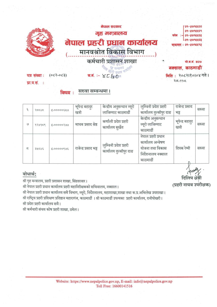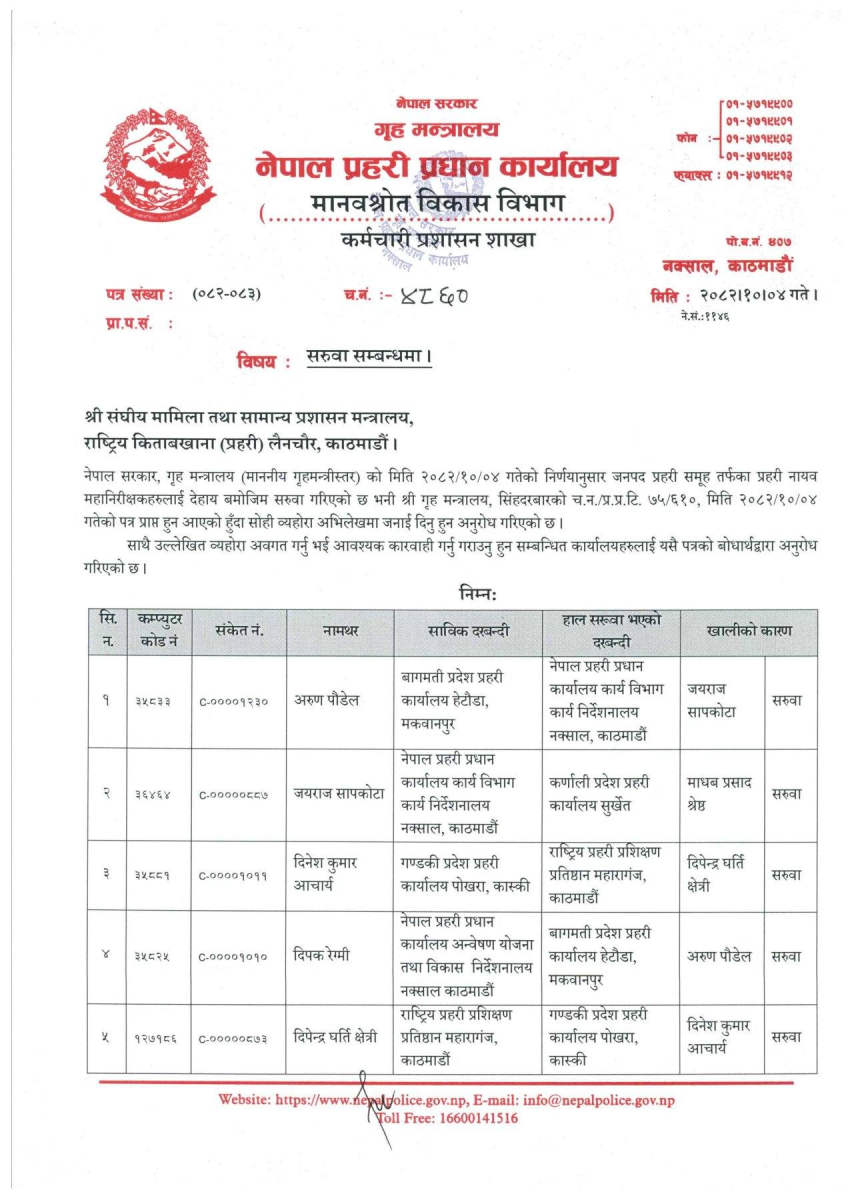 दिपक रेग्मीलाई प्रधान कार्यालय अन्वेषण योजना तथा विकास निर्देशनालयबाट बागमती प्रदेश प्रहरी कार्यालय हेटौंडा सरुवा गरिएको उल्लेख छ। दिपेन्द्र घर्ती क्षेत्री भने राष्ट्रिय प्रहरी प्रशिक्षण प्रतिष्ठानबाट गण्डकी प्रदेश प्रहरी कार्यालय पोखरा सरुवा भएका छन्।
