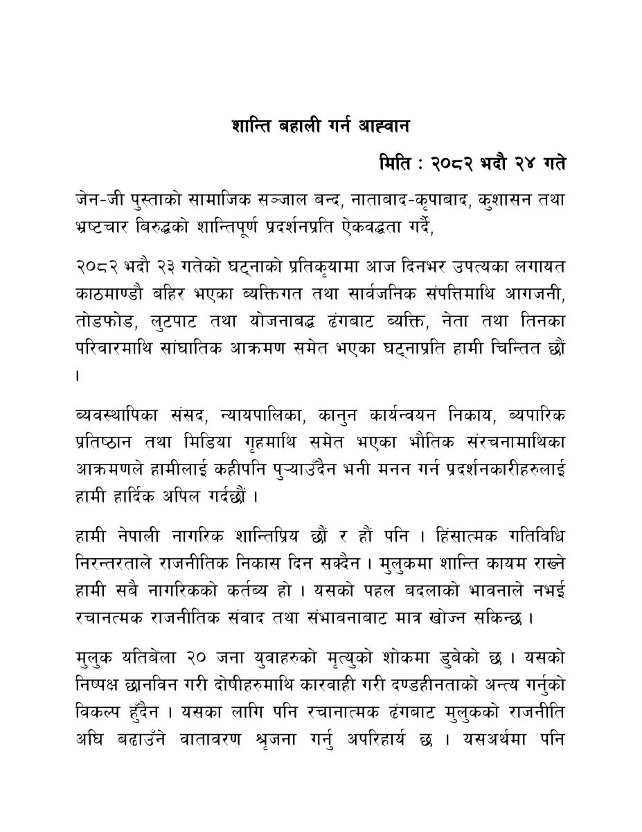 सर्वोच्च अदालतका पूर्वप्रधानन्यायाधीश, शिक्षाविद् र अधिकारकर्मीहरूले संयमता अपनाउन र शान्ति कायम गर्न आह्वान गरेका छन्। मंगलबार संयुक्त अपिल जारी गर्दै उनीहरूले आगजनी, तोडफोड, लुटपाट र सांघातिक आक्रमणप्रति चिन्ता व्यक्त गरेका हुन्।