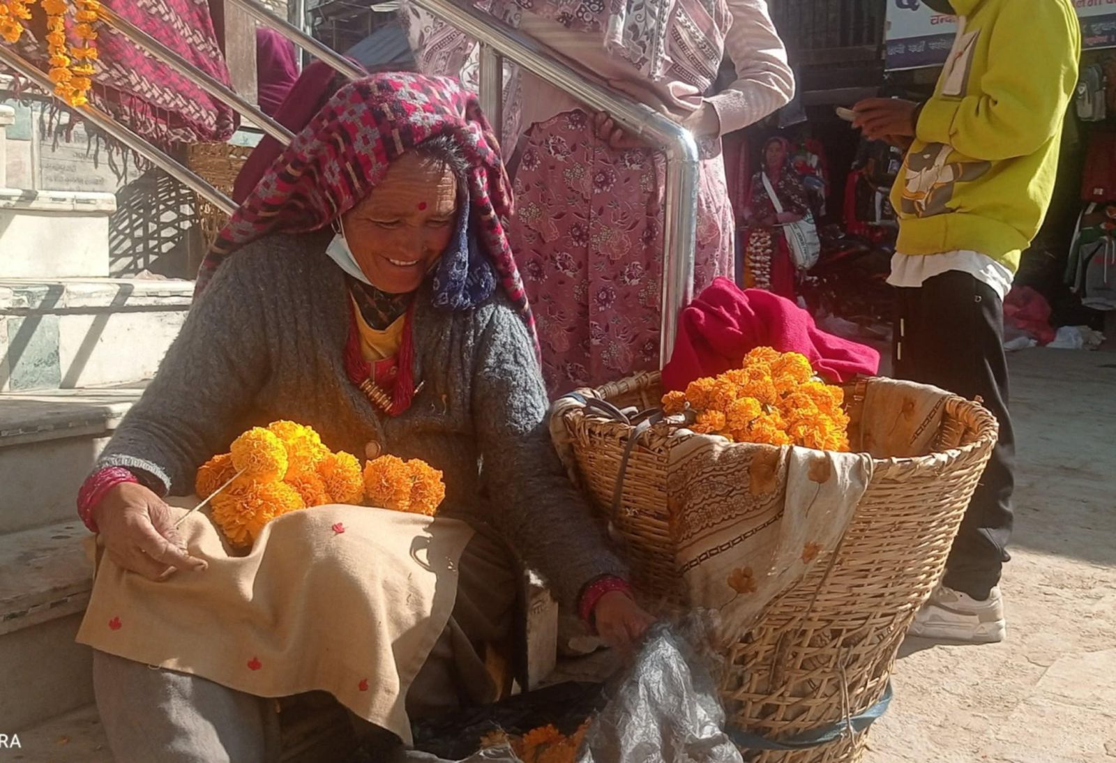 त्यस्तै, तलिउम गाउँकी पञ्चा रोकायाले घरको बारीमा लगाएको फूलबाट माला बनाएर बालमन्दिर छेउ राखिन्। डोकोलाई पूलझैँ सजाएर राखिएको त्यो दृश्य बजारकै आकर्षण बन्यो।