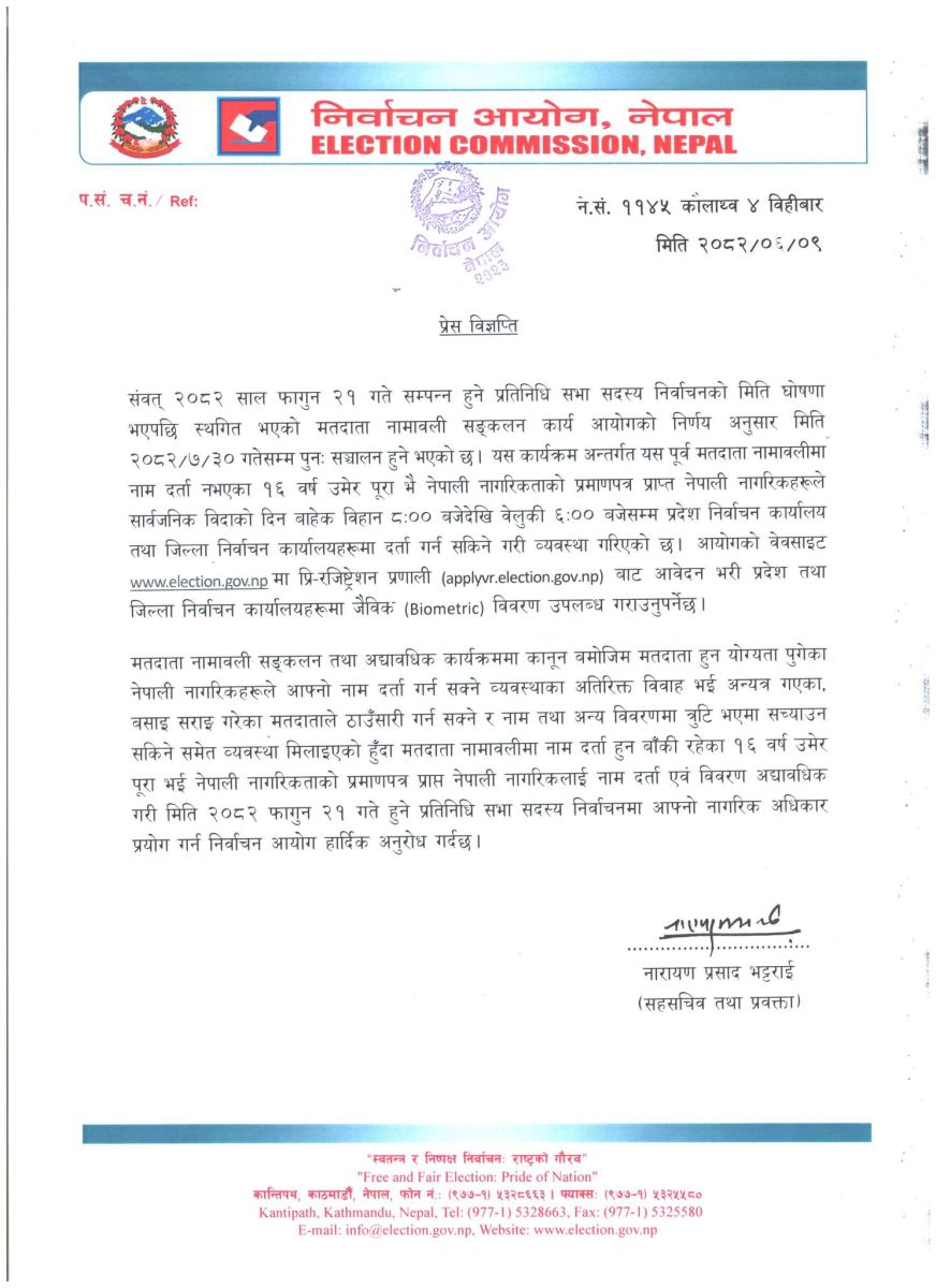 निर्वाचनको मिति घोषणा भएसँगै स्थगित भएको मतदाता दर्ता प्रक्रियालाई आयोगले कार्तिक ३० गतेसम्मका लागि पुनः खुला गरेको हो। आयोगले बिहीबार एक प्रेस विज्ञप्ति जारी गर्दै, यसअघि नामावलीमा नाम दर्ता गर्न छुटेका १८ वर्ष उमेर पूरा भएका नेपाली नागरिकहरूले यो अवसरको सदुपयोग गर्न सक्ने जनाएको छ।
