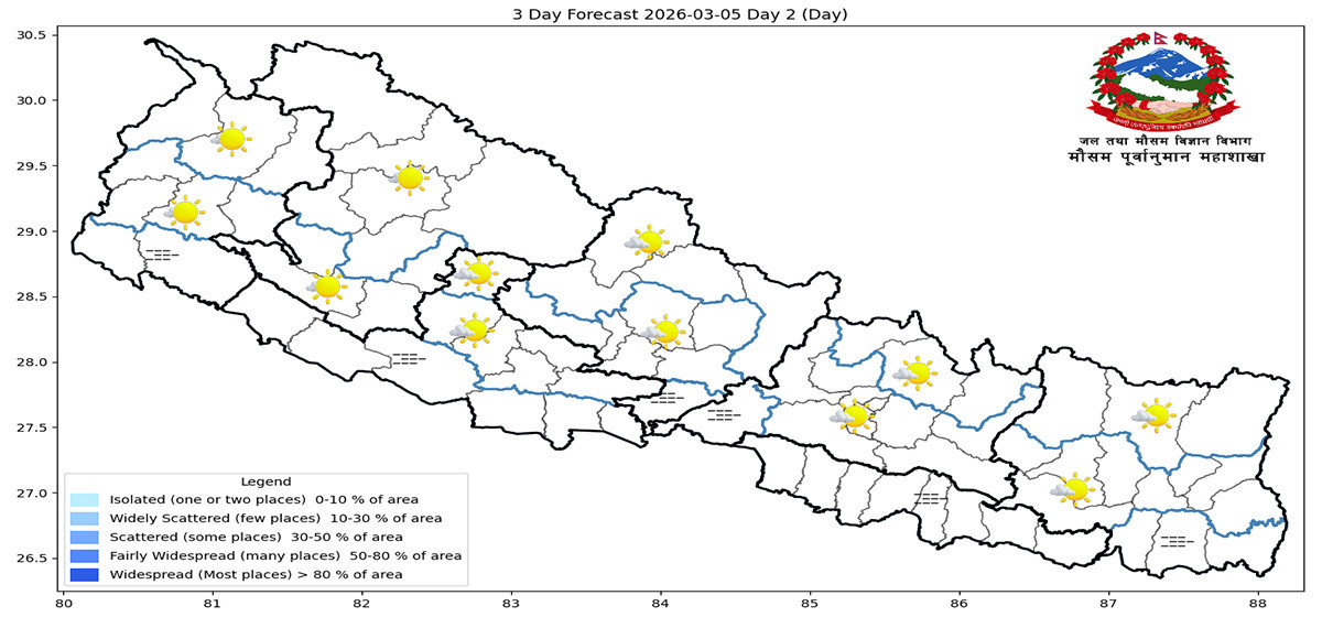 जल तथा मौसम पूर्वानुमान महाशाखाले आज देशका अधिकांश भागमा आज मौसम सफा रहने पूर्वानुमान गरेको छ।