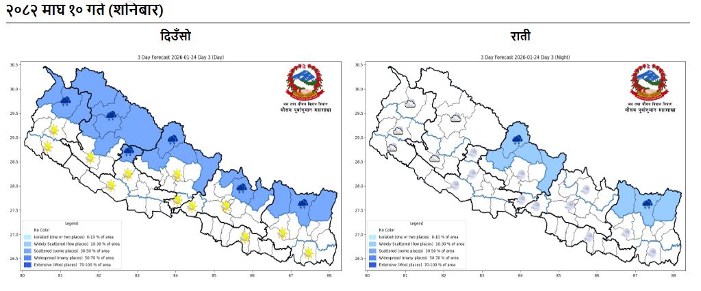 तर भोलि शुक्रबारदेखि भने नेपालको पश्चिमी क्षेत्रबाट वर्षा गराउने वायु प्रणालीको विकास हुने जल तथा मौसम विज्ञान विभागले जनाएको छ । शुक्रबार दिउँसो सुदूरपश्चिमी क्षेत्रबाट प्रवेश गर्ने उक्त मौसमी प्रणालीले सुदूरपश्चिम प्रदेशको थोरै स्थानहरूमा मेघगर्जन चट्याङसहित मध्यम वर्षाको सम्भावना रहेको छ । कर्णाली प्रदेश र सुदूरपश्चिम प्रदेशका उच्च पहाडी तथा हिमाली भूभागका थोरै स्थानहरूमा हल्का हिमपातको सम्भावना पनि रहेको विभागको भनाइ छ ।