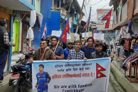 क्रिकेटर सन्दीप लामिछानेकाे पक्षमा सोमवार ताप्लेजुङका युवाहरुले स्वस्फुर्त रूपमा प्रदर्शन गरेका छन्। क्रिकेटर लामिछानेलाई न्याय दिनुपर्ने मागसहित युवाहरुले स्वस्फुर्त रुपमा प्रदर्शन गरेको प्रदर्शनमा सहभागी गोपाल गुरागाँईले जानकारी दिए।
