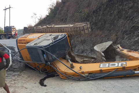 स्काभेटर पल्टिएपछि सिद्धिचरण लोकमार्ग अवरुद्ध