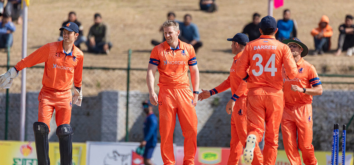 बलिङतर्फ नेदरल्यान्ड्सका टिम भान डर गुगटेनले दुई विकेट लिए भने याब्रान्ड एंगेलब्रेक्ट, रोलेफ भान डर मर्वेल, भिभियन किंग्मा र आर्यन दत्तले समान एक/एक विकेट लिए।