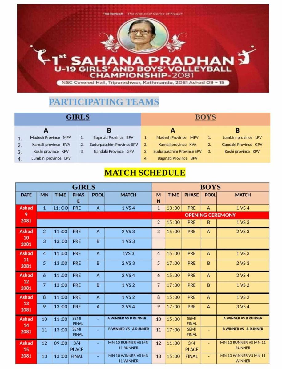 पुरुषतर्फ समूह ‘ए’ मा मधेस, कर्णाली, बागमती र सुदूरपश्चिम तथा समूह ‘बी’ मा लुम्बिनी, गण्डकी र कोशीले प्रतिस्पर्धा गर्नेछन्। यसैगरी महिलातर्फ मधेस, कोशी, कर्णाली र लुम्बिनी समूह ‘ए’ तथा बागमती, गण्डकी र सुदूरपश्चिम समूह ‘बी’ मा रहेर प्रतिस्पर्धा गर्नेछन्।