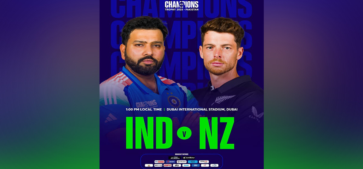 आइसीसी च्याम्पियन्स ट्रफीको फाइनल खेल आज भारत र न्युजिल्याण्डबीच हुँदै छ। दुबईस्थित दुबई इन्टरनेसनल क्रिकेट स्टेडियममा हुने फाइनल खेल नेपाली समय अनुसार दिउँसो २:४५ बजेदेखि सुरु हुँदै छ।