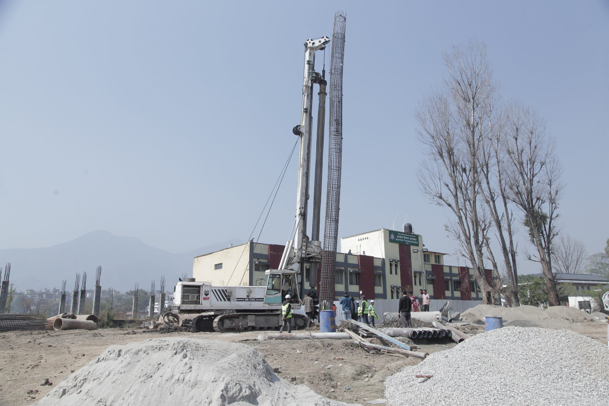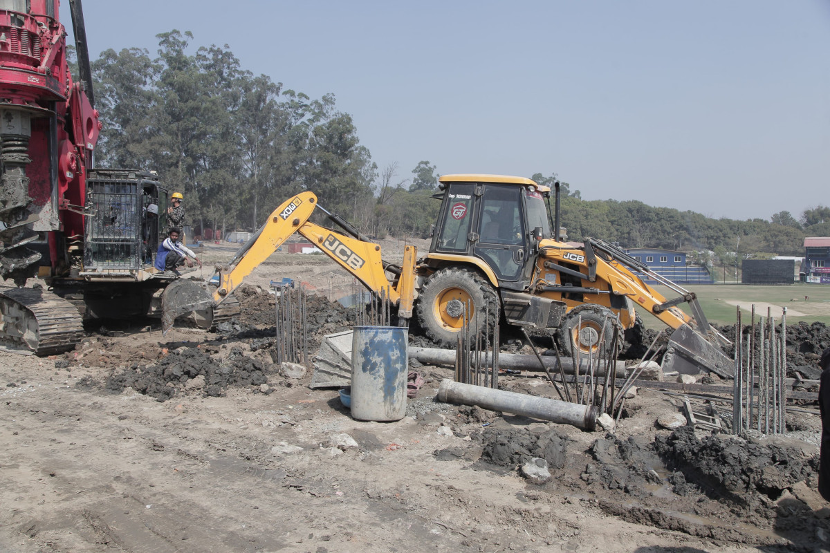 कीर्तिपुर क्रिकेट मैदानमा प्यारापेट निर्माण र फ्लडलाईट जडान कार्य धमाधम भइरहेको छ।