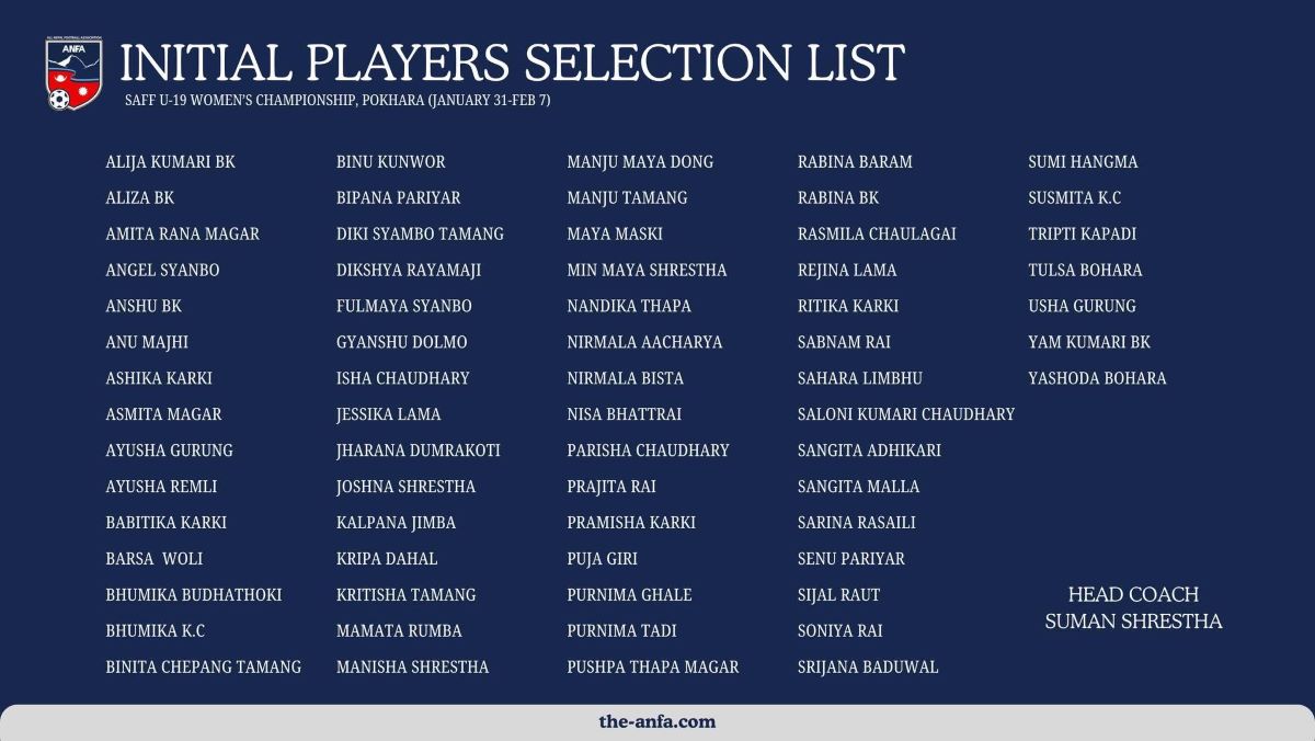 यू-१९ साफ महिला च्याम्पियनसिप खेल्ने प्रारम्भिक टोली घोषण भएको छ।