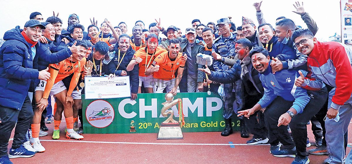 पोखरामा भएको आहा रारा गोल्डकपको उपाधि सशस्त्र प्रहरी बलको एपिएफ क्लबले जितेको छ। पोखरा रंगशालामा शनिबार फाइनलमा सर्वाधिक ६ पटकको उपाधि विजेता मनाङ मर्स्याङ्दी क्लबलाई टाइब्रेकरमा ५–४ गोलअन्तरले हराउँदै एपिएफले पहिलो पटक उपाधि चुम्दै इतिहास रचेको हो।