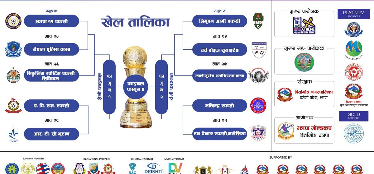 प्रतियोगितामा स्वदेशी तथा विदेशी गरी कुल १० टोलीको सहभागिता रहनेछ। जसमा माघ २५ गते दोस्रो खेलमा त्रिभुवन आर्मी फुटबल क्लब र चर्च ब्वाइज युनाइटेड भिड्नेछन्। तालिकाअनुसार माघ २६ गते पहिलो क्वाटर फाइनलमा उद्घाटन खेलको विजेताले सिक्किमको सिग्लिङ स्पोर्टिङ क्लबको सामना गर्नेछ भने माघ २७ गते दोस्रो क्वाटर फाइनलमा दोस्रो दिनको विजेता र पोखराको लालीगुराँस एसोसिएसनबिच प्रतिस्पर्धा हुनेछ।