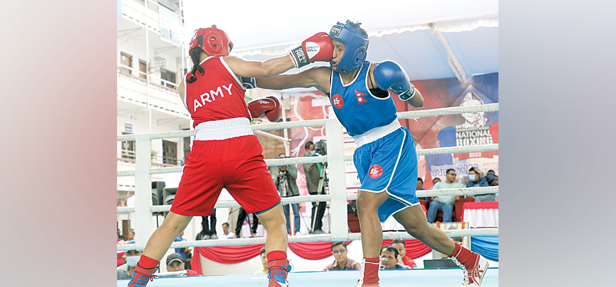 नेपाल आर्मीकी चन्द्रकला थापा र एपिएफकी नाङ्जा बुढा मगर बुधबार गणेशमान सिंह स्मृति राष्ट्रिय बक्सिङ प्रतियोगिताको  महिला ५७ केजी तौलसमूहको सेमिफाइनलमा प्रवेश गरेका छन्।