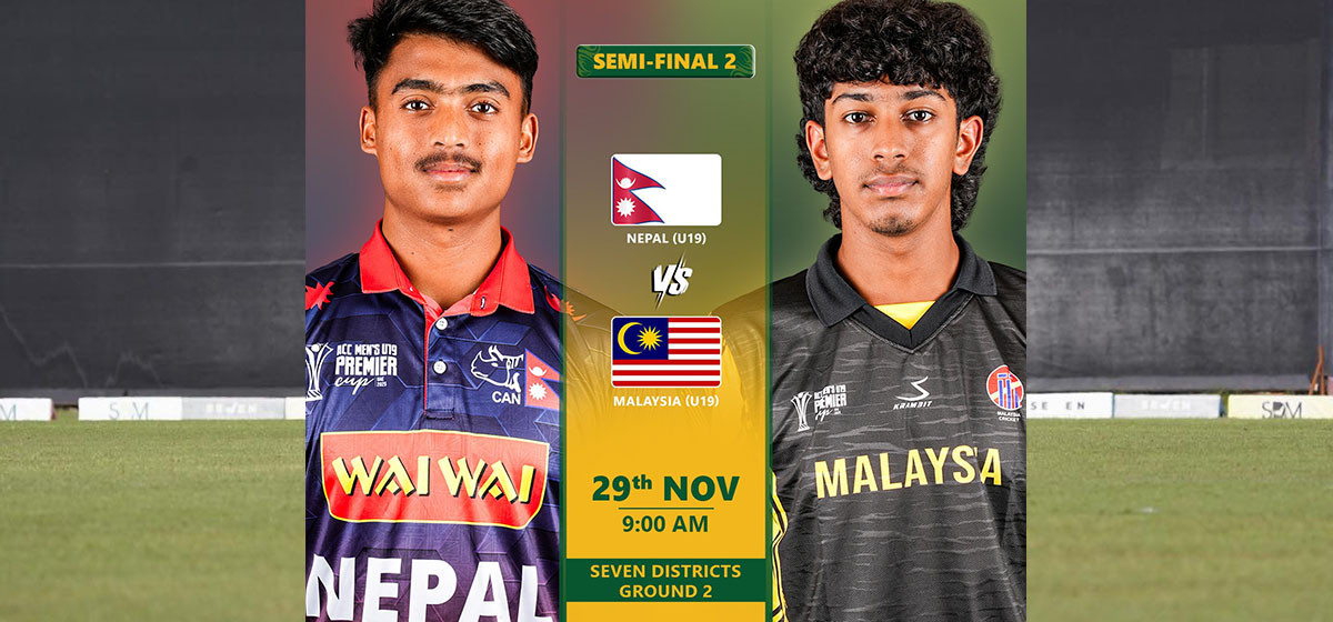संयुक्त अरब इमिरेट्स (यूएई) मा जारी एसीसी पुरुष यू–१९ प्रिमियर कप क्रिकेट प्रतियोगिताको सेमिफाइनलमा नेपालले आज मलेसियासँग खेल्दैछ।